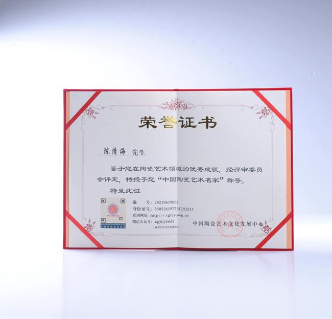 陳清海,1977年出生于世界陶瓷之都德化,中國陶瓷藝術(shù)名家、福建省工藝美術(shù)師、優(yōu)秀創(chuàng)作坊工作室、中國陶瓷藝術(shù)文化發(fā)展中心會員。
