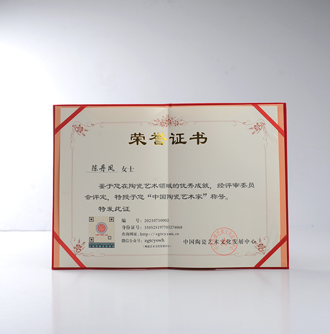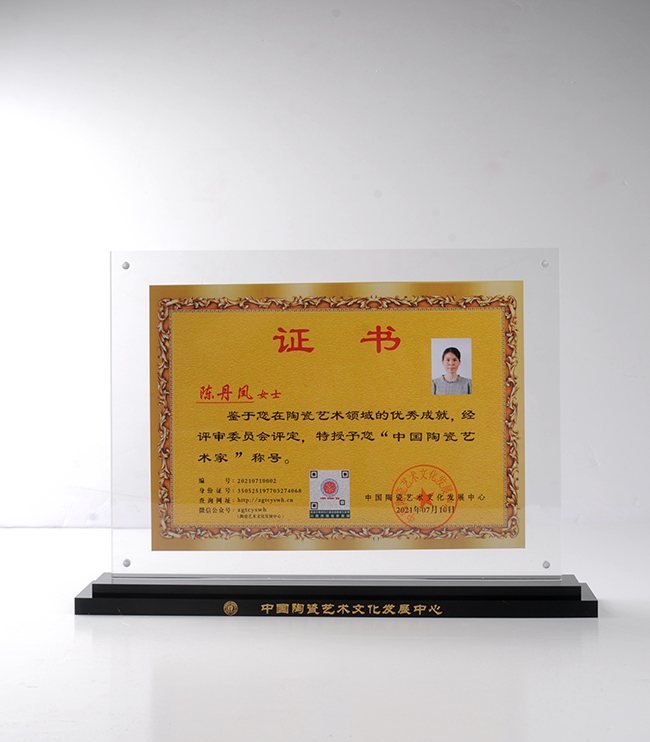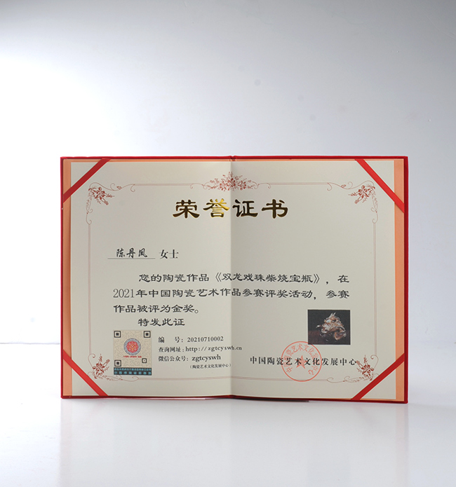 經(jīng)過多年的積累,陳丹鳳創(chuàng)作出一系列優(yōu)秀作品,其作品深受廣大收藏愛好者喜愛,多件作品榮獲各評比金獎,作品《雙龍戲珠柴燒寶瓶》榮獲2021中國陶瓷藝術(shù)名家作品評比金獎等,2021年被中國陶瓷藝術(shù)文化發(fā)展中心評選為“中國陶瓷藝術(shù)家”。