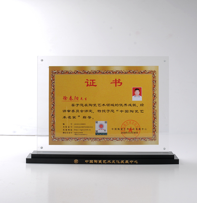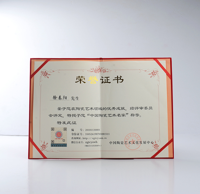 徐春陽從小深受瓷都德化陶瓷文化熏陶,從小便酷愛陶瓷藝術(shù),畢業(yè)后便回到瓷都德化從事陶瓷設(shè)計創(chuàng)作,2012年成立德化縣影陶村陶瓷廠從事陶瓷創(chuàng)作、生產(chǎn)、生銷,2020年成立福建省德化縣桐煜陶瓷有限公司,專注于中國五大名窯之一——哥窯茶器作品、窯變茶器等。經(jīng)過多年的積累其創(chuàng)作出一系列優(yōu)秀作品,深受廣大客商喜愛。多件作品榮獲各評比金獎,作品《鵬程萬里》獲榮2021年中國陶瓷藝術(shù)作品評比金獎。