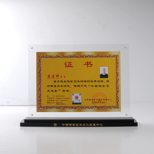 2021年榮獲中國陶瓷藝術(shù)名家稱號,并榮獲“優(yōu)秀創(chuàng)作坊工作室”。