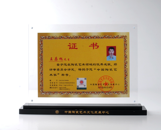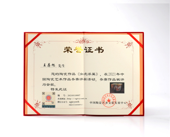 經(jīng)過(guò)10多積累與創(chuàng)作,王存旭創(chuàng)作出上百款經(jīng)典作品,多件作品榮獲各評(píng)比金獎(jiǎng),《國(guó)色西施》榮獲2019年中國(guó)國(guó)際(北京)陶瓷藝術(shù)名家作品展金獎(jiǎng),《如虎添翼》榮獲2021年中國(guó)國(guó)際(北京)陶瓷藝術(shù)名家作品展金獎(jiǎng)等。