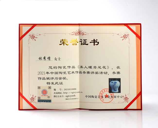 林秀情陶瓷藝術(shù)作品《美人罐鳶尾花》榮獲21年中國陶瓷藝術(shù)作品評獎金獎