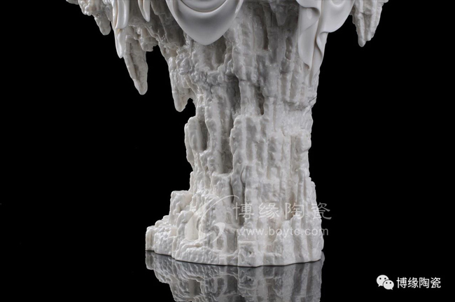 作品巖石雕刻精細(xì)且逼真,巖石凹凸奇兀,手法不落俗套,別具匠心,仿佛見(jiàn)觀音坐立于山巖之上普觀眾生,作品傳承明代“瓷圣何朝宗 ”的藝術(shù)手法及韻味,實(shí)屬一件難得佳作。