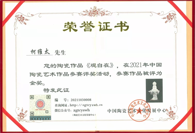 近日,中國(guó)青年陶瓷藝術(shù)家柯維太創(chuàng)作的作品《觀自在》在2021年中國(guó)北京陶瓷藝術(shù)名家作品展評(píng)比上被評(píng)為金獎(jiǎng)。