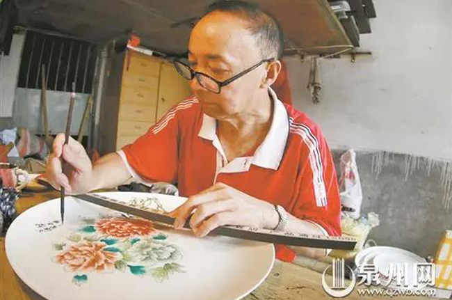 馮金添今年67歲,是德化縣憨鼠愛心小分隊(duì)副隊(duì)長,也是泉州市陶瓷工藝美術(shù)師。1973年,他進(jìn)入德化縣新亭瓷廠彩畫車間工作,得到德化瓷壇老前輩的傳授和悉心指導(dǎo),技藝大進(jìn)。1992年下崗后,他從事陶瓷原料批發(fā)生意,擔(dān)任過村黨支部書記。無論生意和社會職務(wù)多忙,他仍然堅(jiān)持創(chuàng)作。在一間由車庫改裝成的工作室,他創(chuàng)作出了許多令人稱道的好作品。除了專注陶瓷創(chuàng)作,他還特別熱心公益事業(yè),常常將售賣作品的錢捐贈給困難群體。從2015年開始,他在網(wǎng)上拍賣親手所畫的掛盤、畫作,所得款項(xiàng)5萬多元,全部捐獻(xiàn)給需要幫助的人。