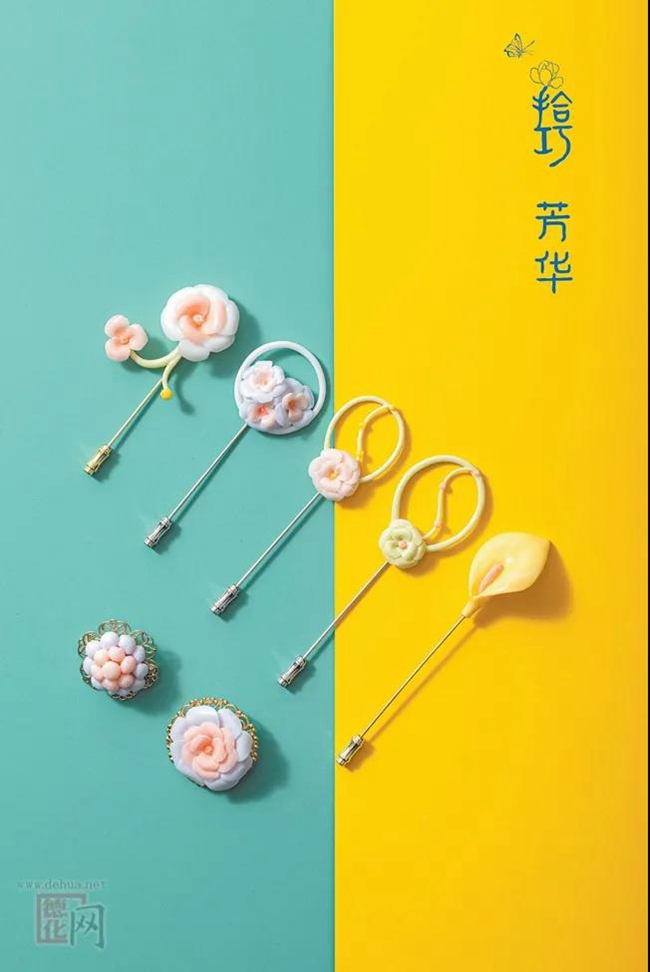 《芳華》胸針均為手工捏花加定制金屬配件,包含春、夏、秋、冬四個系列,分別以手工捏塑各種花卉,青花手繪,手工捏塑各類碩果,盤條編織對應(yīng)。不同季節(jié)的花語,表達(dá)的是不同時間的告白和情語。繡球花,意為永恒,祝愿愛情親情有美好的結(jié)局;馬蹄蓮,意為幸福,寓意靜待愛情的少女,含羞矜持、圣潔優(yōu)雅;薔薇,意為誓言,初戀般美麗無比。2020年6月作品《芳華》榮獲自在德化伴手禮設(shè)計(jì)大賽二等獎。