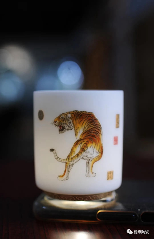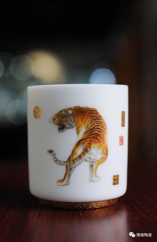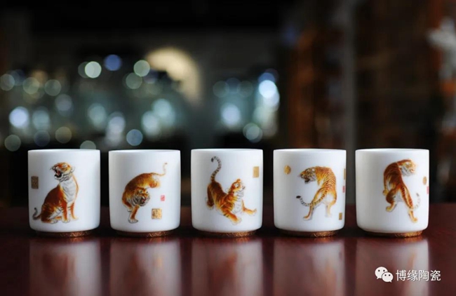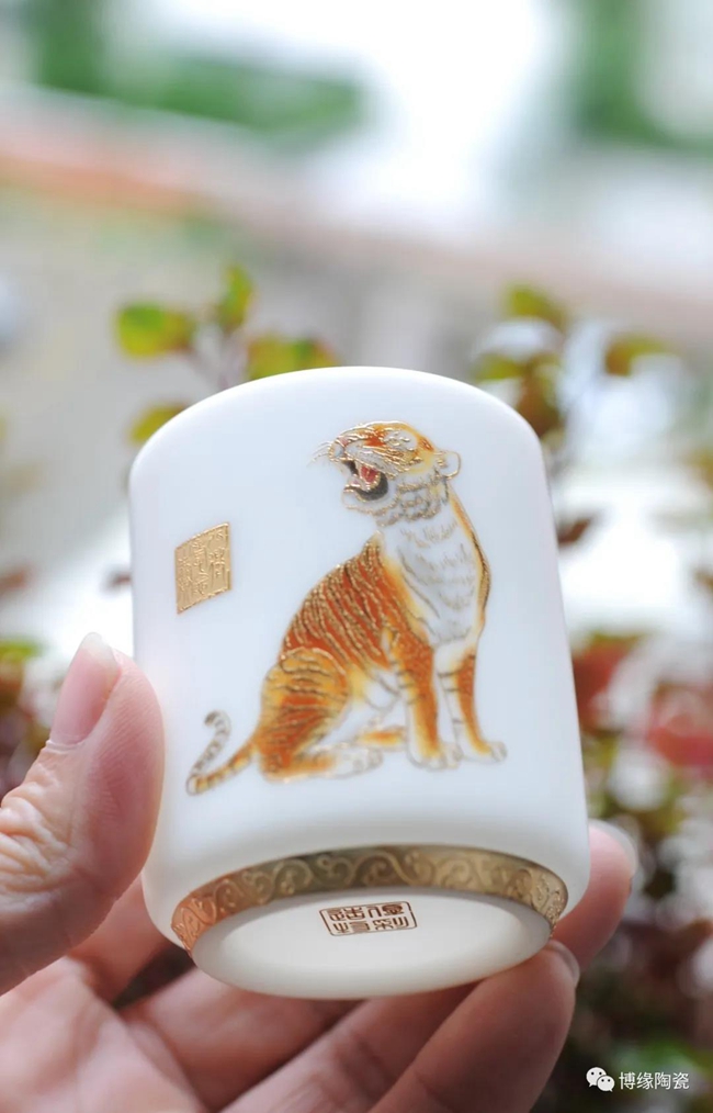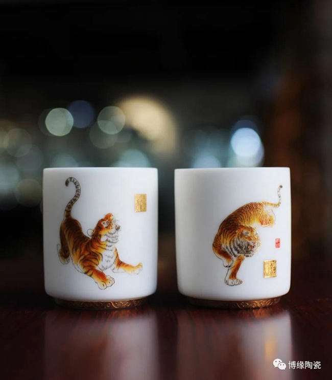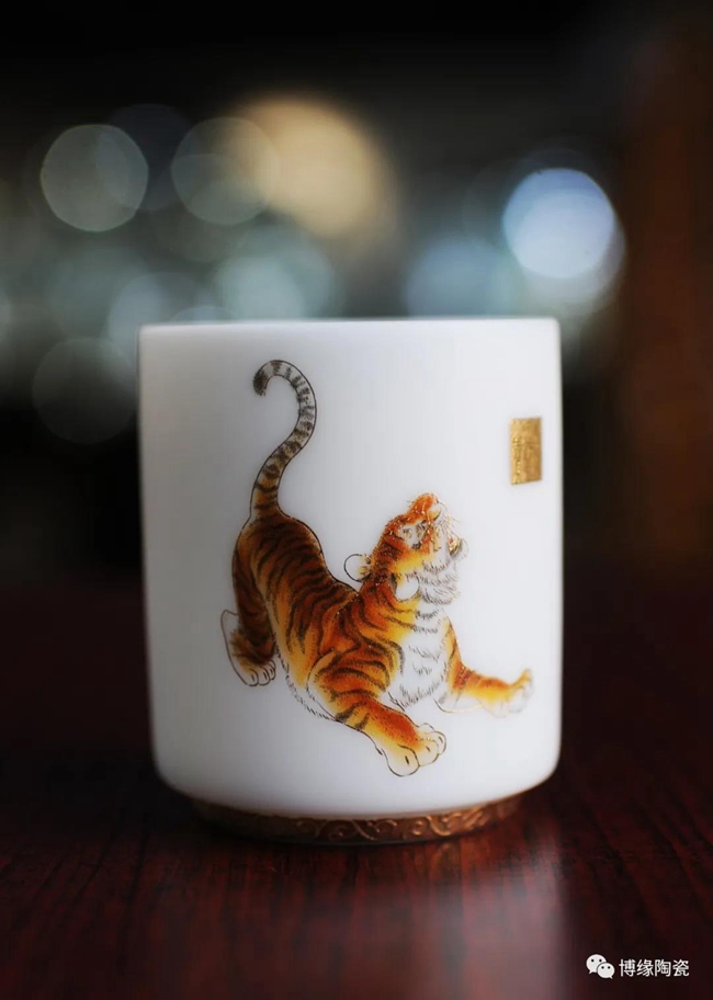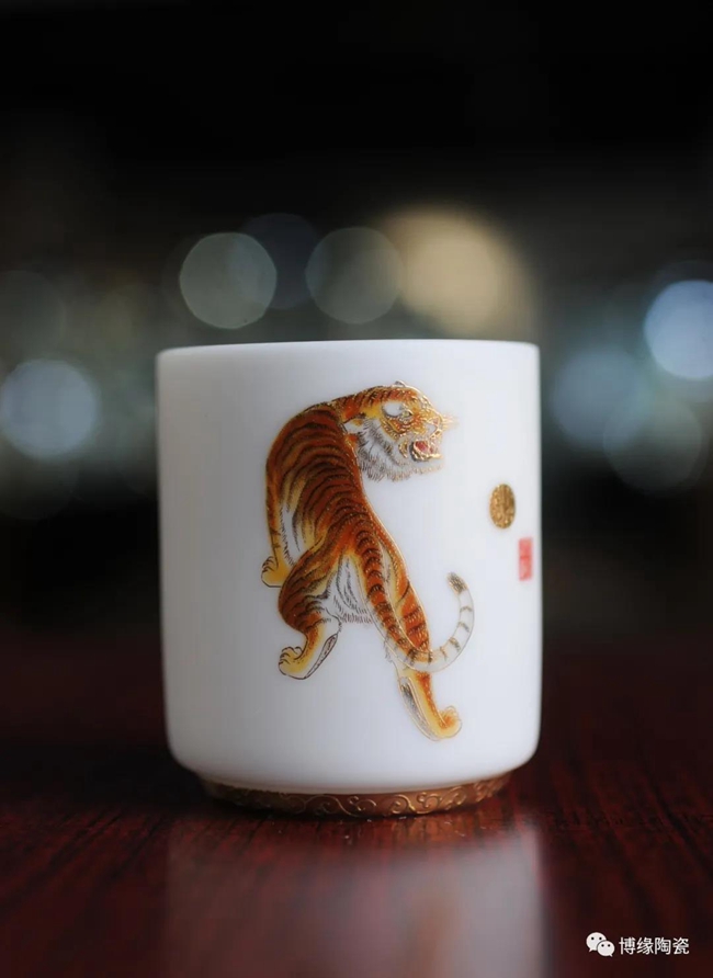 在2022年虎年來臨之際,博緣陶瓷特推出“五福(虎)臨門”羊脂玉瓷杯,五福:第一福"長壽"、第二福"富貴"、第三福"康寧"、第四福"好德"、第五福"善終"。也有人簡稱為壽富康德善。每款杯子采用不同造型的虎圖案,栩栩如生,靈活靈現(xiàn),采用高清堆料花紙工藝,手工描金,使作品更具尊貴,作品采用30000多元/每噸瓷泥1300多度高溫?zé),瓷胎薄潤如玉,具有較高的鑒賞價值。