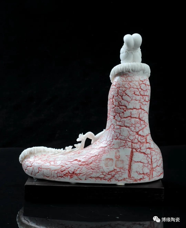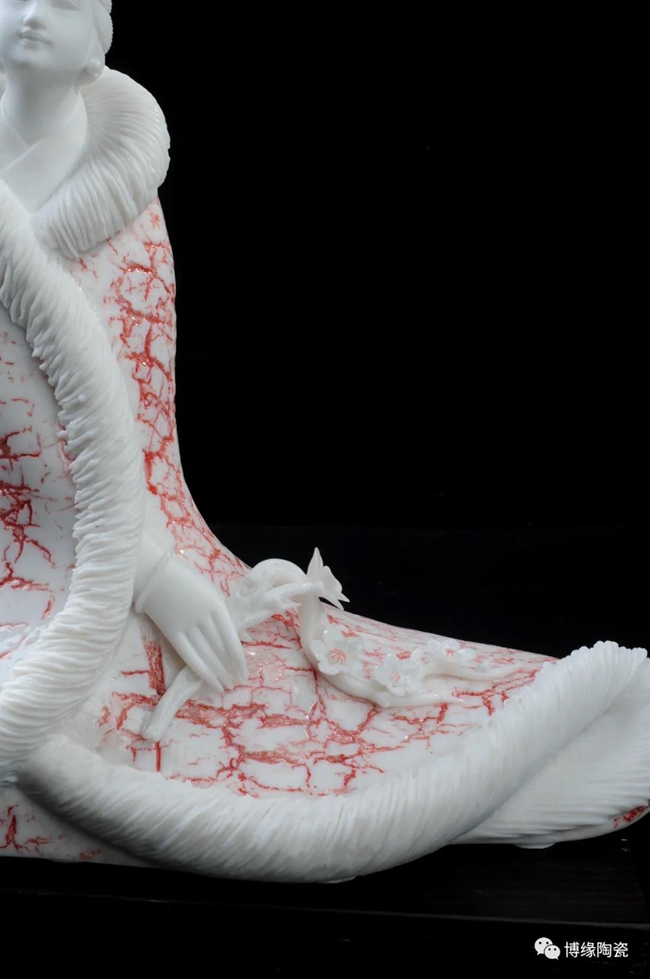 《詠梅》是當(dāng)代著名陶瓷大師,中國工藝美術(shù)大師——柯宏榮、陳桂玉夫婦創(chuàng)作的作品。作品以德化白瓷為胎質(zhì),以寫意雕塑手法,見女子身披粉色雪狐棉衣,坐于茫茫雪花之中,一手持梅花,頭微微上仰,仿佛沉醉于梅花花海之中,作品頭飾、衣飾、發(fā)絲、梅花純手工雕刻,所到之處無不精細贊嘆,足見大師在創(chuàng)作時的獨運匠心,作品底部有中國工藝美術(shù)大師柯宏榮、陳桂玉夫婦手刻簽名,是一件不可多得的收藏精品。