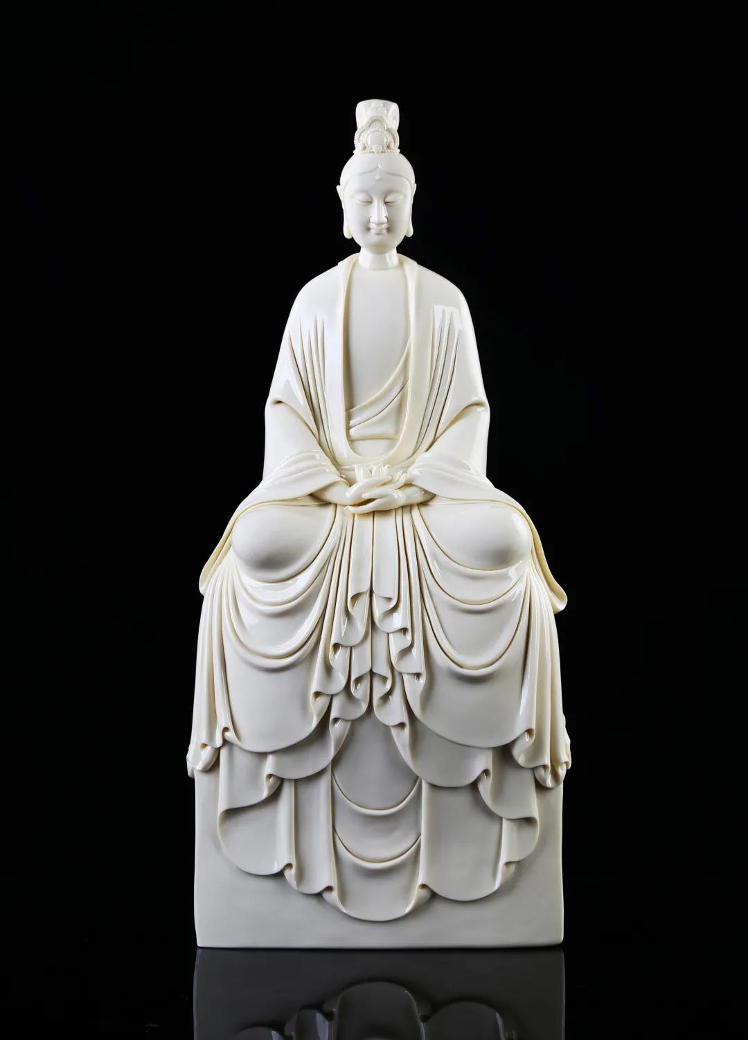 陳建陽的《心有蓮花》觀音瓷塑像是德化窯瓷塑人物造像的杰作。菩薩像頭戴寶冠,寶冠上有諸多裝飾,額頭寬闊,雙目微閉,端莊慈祥,氣質(zhì)高雅,神情妙不可言。雙腿盤坐,雙手置于兩腿之上,衣紋線條下垂,神態(tài)優(yōu)美,著力注重人物內(nèi)在性格和氣質(zhì)的刻畫,呈現(xiàn)出溫潤含蓄、生動精巧、自然灑脫的藝術(shù)魅力,人物的內(nèi)在性情能從臉部的變化,眼神的表達和頭飾細節(jié)的處理中得到深入的體現(xiàn),可謂稱得上“妙相”。