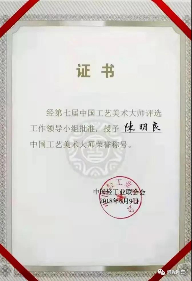 陳明良,中國工藝美術(shù)大師,中國陶瓷藝術(shù)大師,享受國務院特殊律貼,第五批國家非物質(zhì)文化遺產(chǎn)《德化瓷燒制技藝》代表性傳承人,國家一級技師,高級工藝美術(shù)師,職業(yè)藝術(shù)品鑒定師,福建省工藝美術(shù)大師,中國陶瓷工業(yè)協(xié)會常務理事,福建省古玩工藝協(xié)會常務副會長,德化縣收藏家協(xié)會會長,泉州工藝美術(shù)職業(yè)學院客座教授,泉州市特色專業(yè)領軍人才,德化縣明玉陶瓷研究所藝術(shù)總監(jiān)!