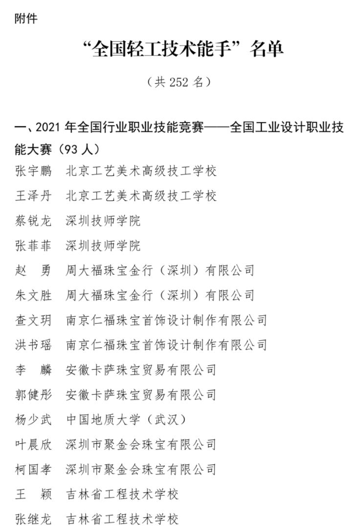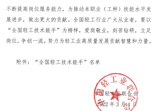 “全國(guó)輕工技術(shù)能手”榮譽(yù)光榮榜