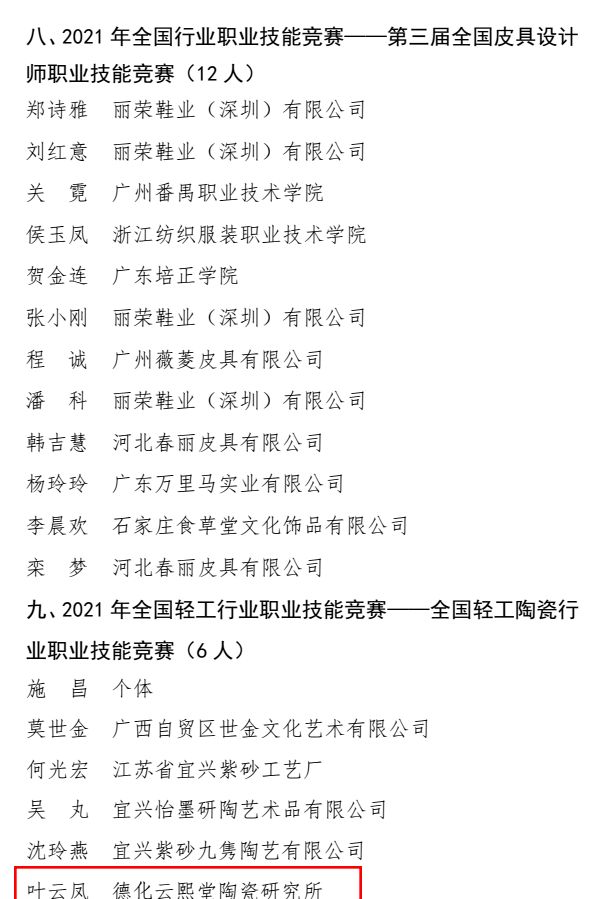 近日,中國(guó)輕工業(yè)聯(lián)合會(huì)表彰了一批在2021年輕工各類職業(yè)技能競(jìng)賽活動(dòng)中取得優(yōu)異成績(jī)的選手,由福建省陶瓷行業(yè)協(xié)會(huì)選拔入圍第七屆全國(guó)陶瓷行業(yè)職業(yè)技能競(jìng)賽總決賽的林宛文、蘇基石、林杰鋒、張麗芬、林祿揚(yáng)、王代丁、彭茶水、葉云鳳榮獲“全國(guó)輕工技術(shù)能手”榮譽(yù)稱號(hào)。