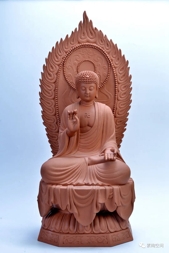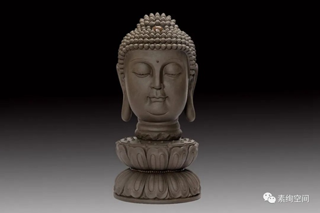 章再守的作品以佛教、禪意作品居多,結(jié)合紫砂的粗獷古樸,作品禪味極濃,有自己的獨(dú)特風(fēng)格。他所塑造的達(dá)摩造像,不同于德化白瓷作品中的精細(xì)光潔,而顯得更加率性,更加生活化與情趣化。而大寫意手法的應(yīng)用也有別于德化傳統(tǒng)白瓷雕塑所呈現(xiàn)的衣紋,概括洗練之下強(qiáng)化了達(dá)摩的精神與性格。又如紫砂雕塑作品《古蓮座如來(lái)佛頭》,注重追求外在形象的表現(xiàn)與內(nèi)在神韻的融合,既保留了神秘奧妙的宗教靈性,又蘊(yùn)含了和諧健康的美好意象,獲得第七屆中國(guó)(莆田)海峽工藝品博覽會(huì)金獎(jiǎng)。