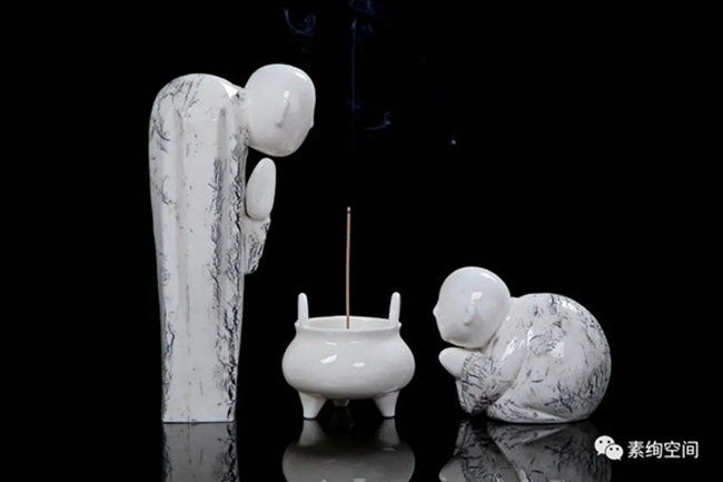 《誠(chéng)心誠(chéng)意線香爐》這組作品是場(chǎng)景式的組合呈現(xiàn)。正中一純凈無(wú)瑕、潔白如玉的三足爐,燃著的線香插于其中,左右兩個(gè)夸張寫意化的小彌陀,一站一跪,十分可愛,卻營(yíng)造出悠遠(yuǎn)的禪意來(lái)。