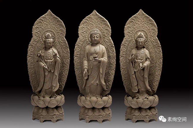 《弘一大師》在造型設(shè)計(jì)上著力表現(xiàn)大師“半世瀟灑半世僧”的獨(dú)特經(jīng)歷。左手衣袖微微向后揮起,飄逸灑脫,象征前半生的人生歷程,已然在身后;右手持珠平胸,嚴(yán)謹(jǐn)寂靜,寓意后半生皈依佛門,靜心修持。整件作品動(dòng)靜結(jié)合,刻畫弘一法師莊嚴(yán)又自在無(wú)礙,心如明月,具足萬(wàn)德,花枝春滿,天心月圓。