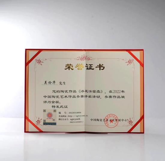 《冰花汝窯壺》榮獲2022年中國陶瓷藝術(shù)作品評比金獎