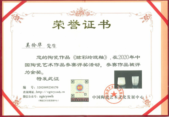 2011年吳倫華來到世界陶瓷之都德化并創(chuàng)辦吳倫華制釉廠,經(jīng)過20多年科研與實(shí)踐,吳倫華在陶瓷仿古釉、窯變釉、汝窯等釉見解獨(dú)到、推陳出新,公司成立以來,重視團(tuán)隊(duì)協(xié)作,注重研發(fā),所研發(fā)產(chǎn)品深受陶瓷企業(yè)、工藝美術(shù)大師喜愛,其產(chǎn)品遠(yuǎn)銷國內(nèi)外及各陶瓷產(chǎn)區(qū),2020年開發(fā)出“眩彩玲瓏釉”并榮獲2020年中國(北京)陶瓷藝術(shù)作品展金獎。2022年作品《冰花汝窯壺》榮獲中國陶瓷藝術(shù)作品評比金獎。“入窯一色,出窯萬彩”正是顏色釉特點(diǎn)的最好寫照,吳倫華憑借20多年研發(fā)在陶瓷制釉領(lǐng)域不斷領(lǐng)先,并在世界瓷都德化締造晶窯,產(chǎn)品燦燦中外!