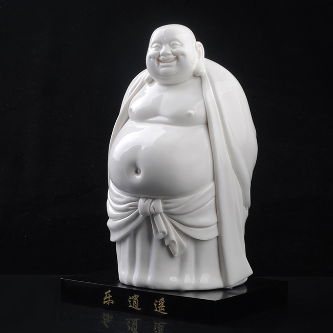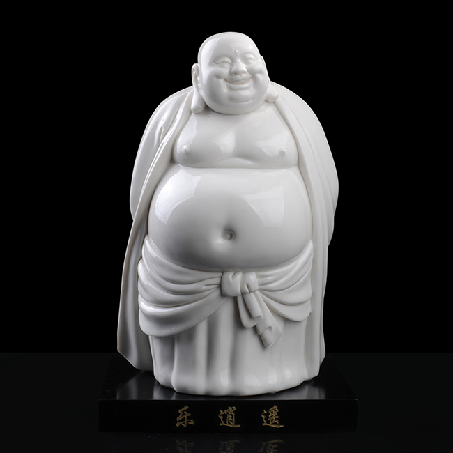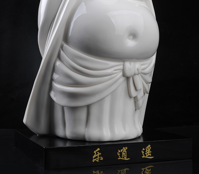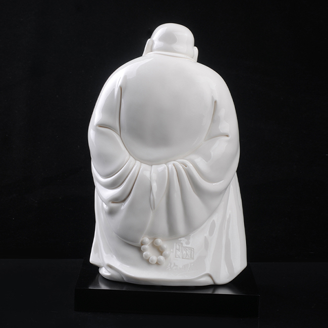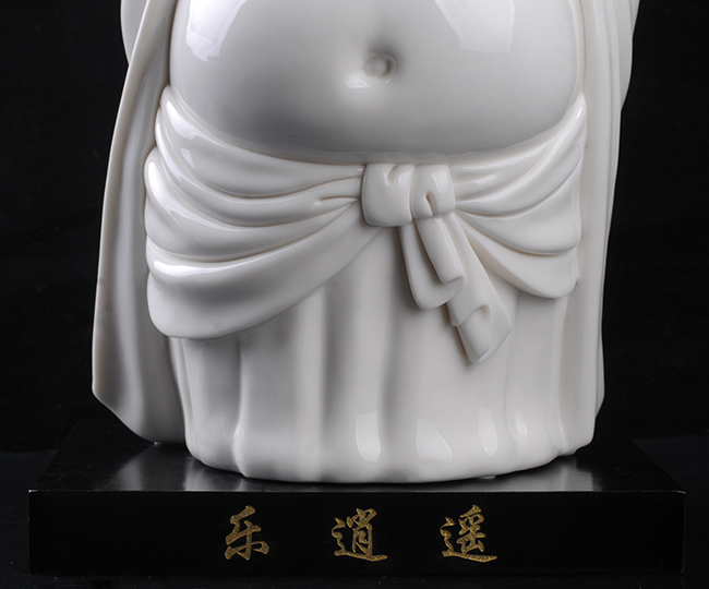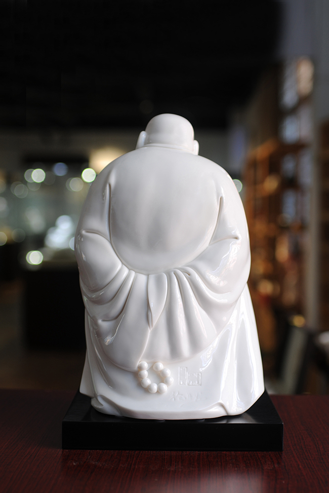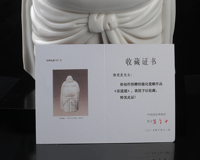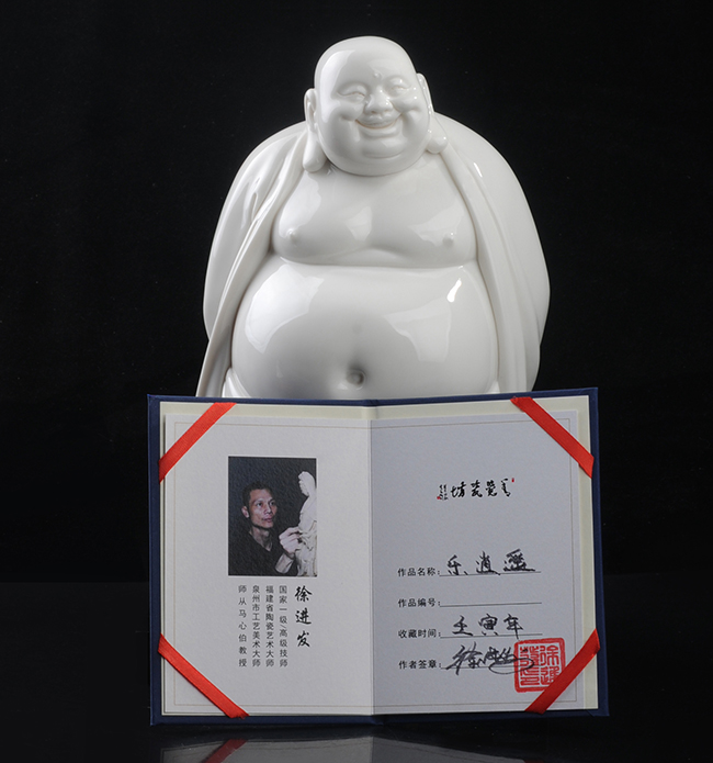 《樂逍遙》由福建省陶瓷藝術(shù)大師——徐進(jìn)發(fā)制作,作品長20.5cm,寬17cm, 高31cm,采用德化優(yōu)質(zhì)高嶺土,經(jīng)1300多度高溫?zé),作品胎體溫潤,線條簡潔柔美,精雕細(xì)刻,彌勒佛造型喜笑顏開,酒窩深陷,大耳垂肩,逍遙自在,形象刻畫生動,栩栩如生,手工雕刻展現(xiàn)精湛雕工。作品被中國國家博物館收藏,背面落有徐進(jìn)發(fā)大師手簽名及印章款,具有很高的收藏及鑒賞價值。