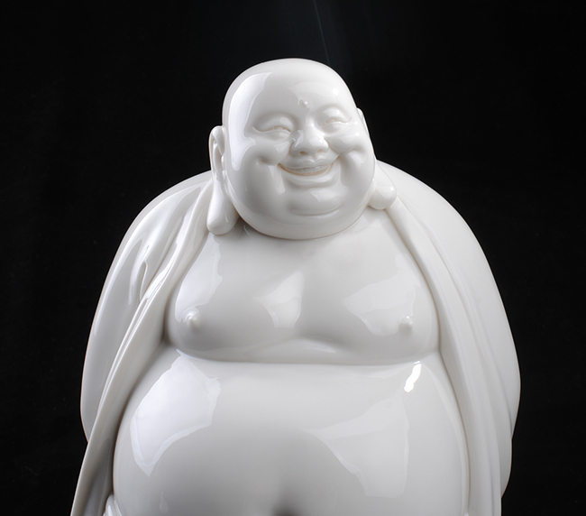 彌勒佛喜笑顏開,酒窩深陷,大耳垂肩,逍遙自在,刻畫生動