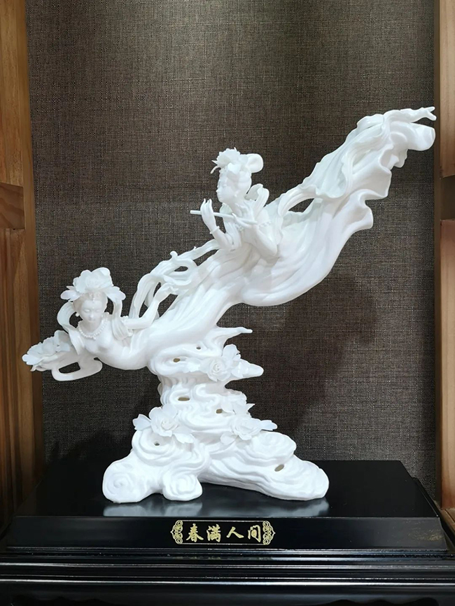 “飛行云中,神化輕舉,以為天仙,亦云飛仙”。邱桂還的《春滿人間》創(chuàng)作思路來源于敦煌壁畫飛天。在傳統(tǒng)瓷雕中,人物的塑造大部分以單體為主,該作品突破單體,傳承并創(chuàng)新,以泥塑去表現(xiàn)人物的形與神。此飛仙懸浮凌空,衣裙飄曳,巾帶飛舞,姿勢自如優(yōu)美,似凡塵中來。飛天落處,朵朵香花飄落,頗有"天花亂墜滿虛空"的詩意。洛神是中國先秦神話中,司掌洛河的地方水神。洛神作為理想美神的化身,喻指美麗的愛情、靚麗的青春、美好的生活。陳碧珍的《洛神》優(yōu)選顏色釉,巧妙運(yùn)用亮麗豐富的色彩繪制婀娜多姿的洛神。以優(yōu)美抽象的曲線,與圓盤完美結(jié)合,相映成趣。其構(gòu)圖飽滿,虛實(shí)得當(dāng),筆法豐富,簡潔灑脫,富有美感