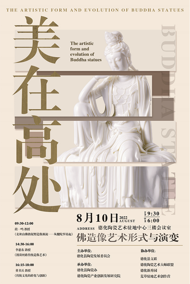 2022年8月10日,由德化縣陶瓷發(fā)展委員會(huì)主辦,陶瓷辦、德化陶瓷產(chǎn)業(yè)創(chuàng)新發(fā)展研究院承辦的名師講堂,將于德化陶瓷藝術(shù)駐地中心舉行。本次活動(dòng)特邀清華大學(xué)美術(shù)學(xué)院董書兵教授、北京工業(yè)大學(xué)藝術(shù)設(shè)計(jì)學(xué)院李惠東教授、麥積山石窟藝術(shù)研究所研究員段一鳴等佛造像專家學(xué)者從專業(yè)的角度,剖析陶瓷宗教造像雕塑語言,探索魅力無窮的佛教造像藝術(shù)。
