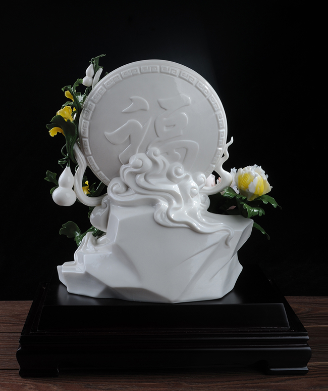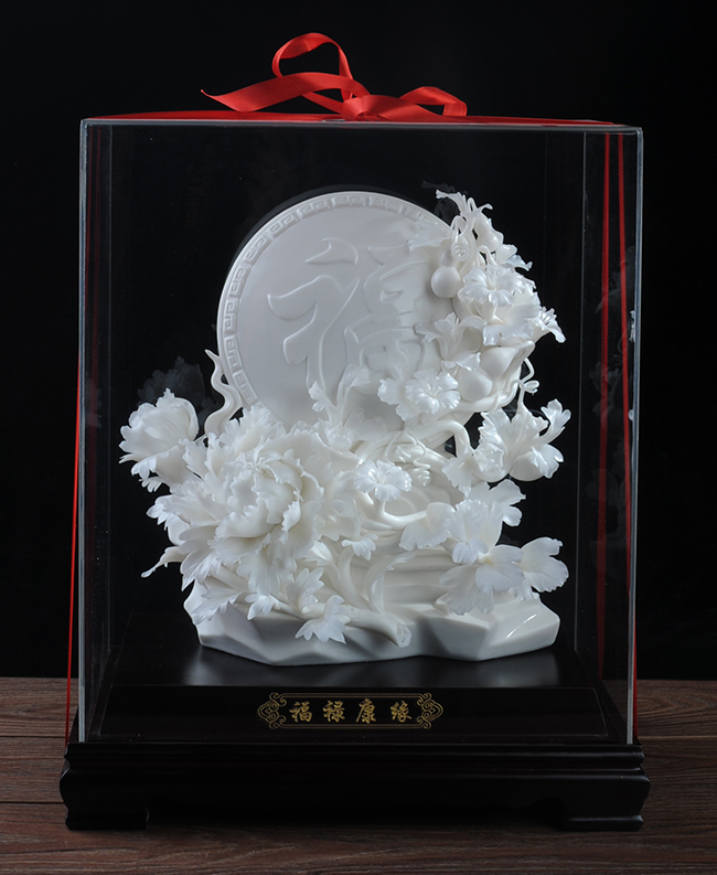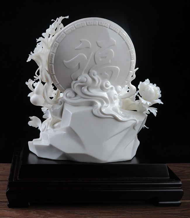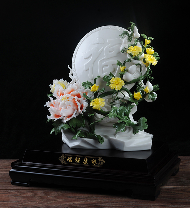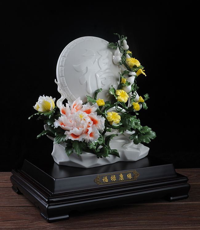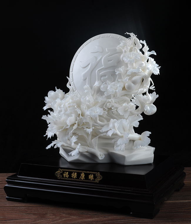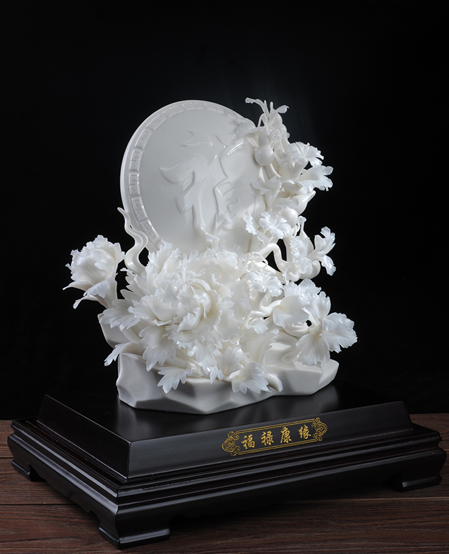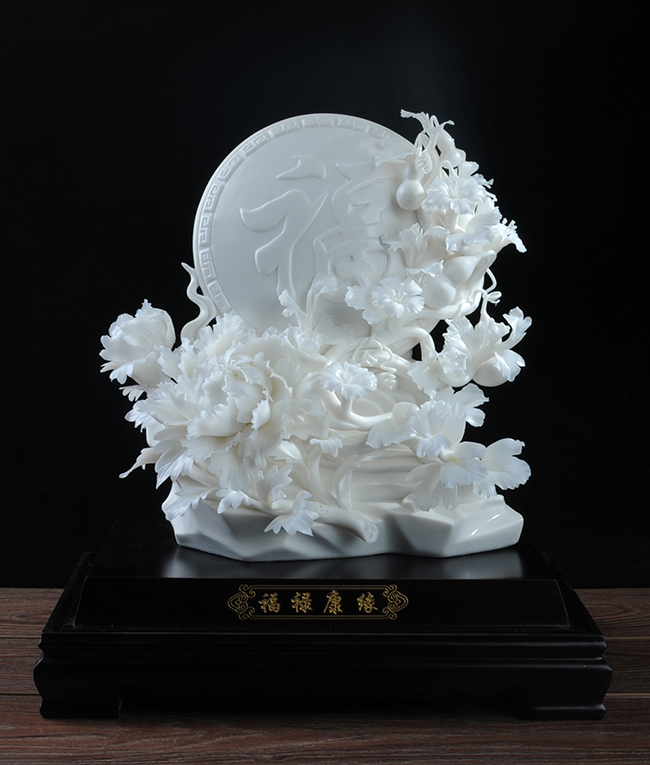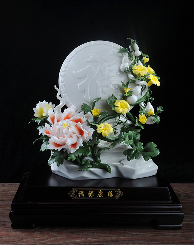 《福祿康緣》作品由工藝美術(shù)大師設(shè)計(jì)創(chuàng)作,以具有”中國(guó)白" 的德化瓷與傳統(tǒng)如意文化相結(jié)合雕刻而成。作品雕刻精細(xì),巖石上可見有牡丹、葫蘆,福字雕刻點(diǎn)綴。葫蘆諧音福祿,有著財(cái)富、富貴的象征,牡丹代表富貴,綠葉枝干線條流暢、簡(jiǎn)潔,整件作品構(gòu)思巧妙,布局合理,把福祿康緣這一美好寓意表現(xiàn)得淋漓盡致。作品是店鋪、辦公、家居客廳、書房擺設(shè),禮贈(zèng)、收藏的好選擇。
