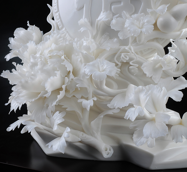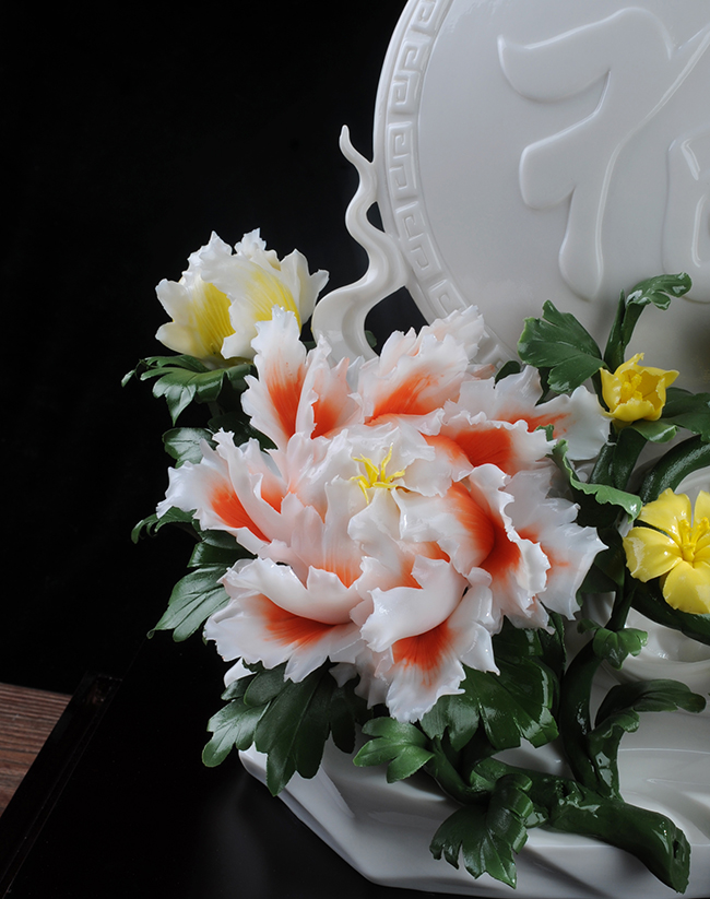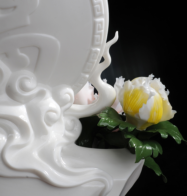 采用高嶺土為制作材料,經(jīng)手工雕刻,全手工制作,牡丹花刻畫一絲不茍或薄如蟬翼,或嬌艷欲滴,最終形成件美輪美負(fù)的瓷藝術(shù)作品。