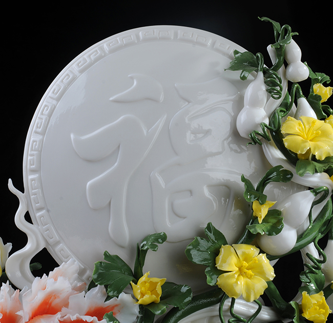 作品是采用高嶺土為制作材料,經(jīng)過原料研磨拌漿-濾泥-塑型-成型-晾干-素?zé)┯?釉燒等多道工藝制作流程,最終形成一件美輪美奐的瓷藝術(shù)作品。形象逼真地再生再現(xiàn)了牡丹花、葫蘆、枝干的形態(tài)、神韻、色彩和特殊寓意,立體陶瓷造型真實(shí)感強(qiáng),巧奪天工,相互映襯,相得益彰。