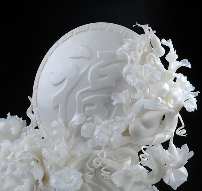 作品沿用德化傳統(tǒng)的制瓷技法“捏、塑、雕、鏤、貼、接、推、修。