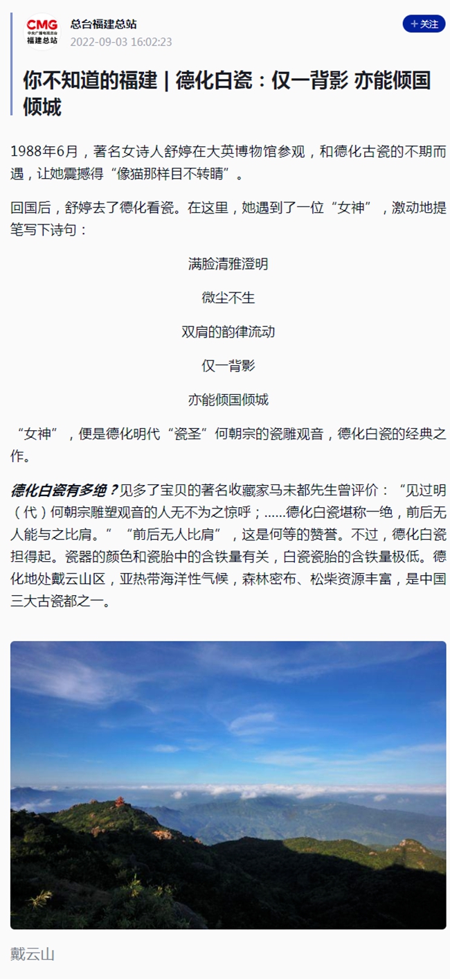 3日,央視新聞客戶端報(bào)道德化白瓷,刊發(fā)了《你不知道的福建 | 德化白瓷:僅一背影 亦能傾國傾城》圖文報(bào)道。