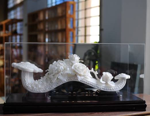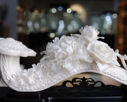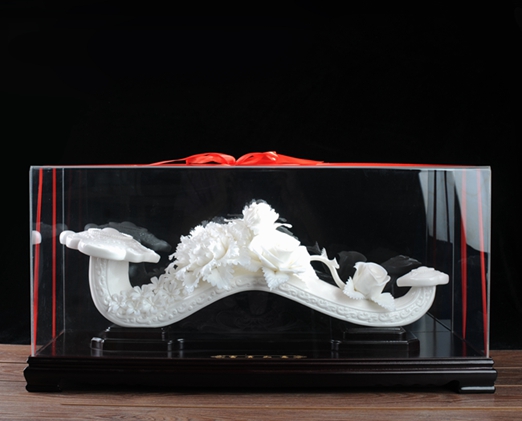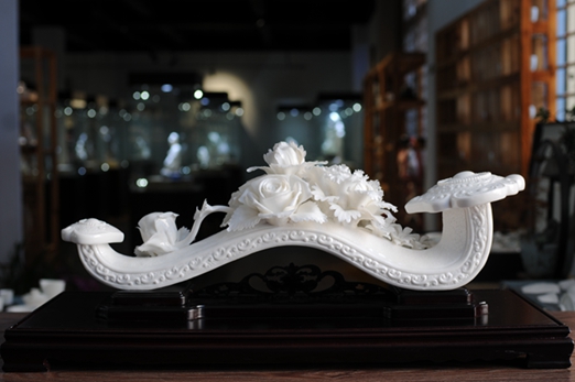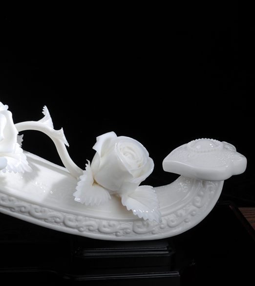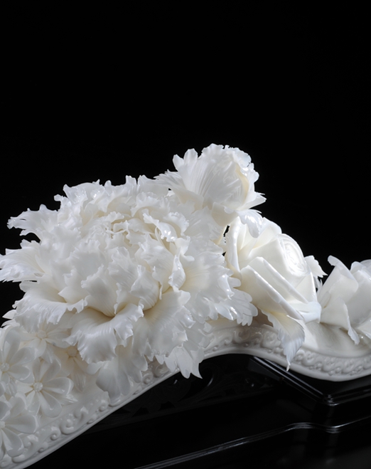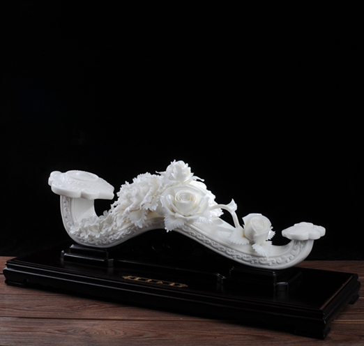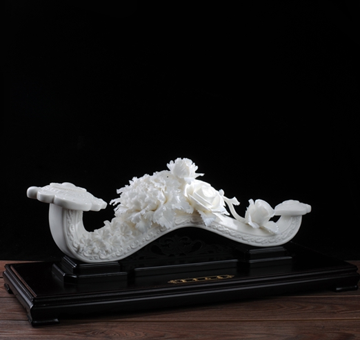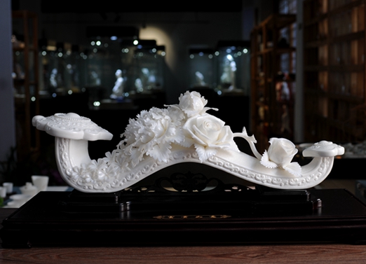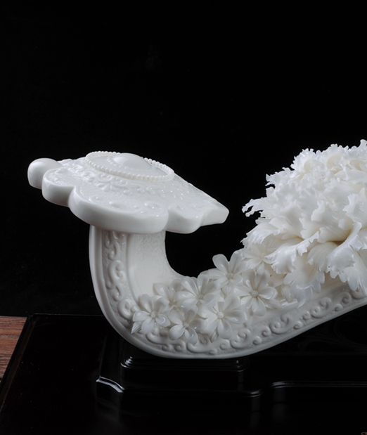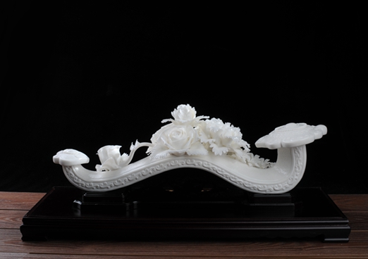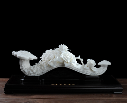 《富貴如意》以德化具有溫潤如玉的”中國白" 為胎質(zhì)塑造,德化瓷與傳統(tǒng)如意文化相結(jié)合雕刻而成。 作品如意之上可見有牡丹、玫瑰花、小花雕刻點(diǎn)綴等,白色的玫瑰花干凈無暇,牡丹代表富貴,樹葉枝干線條流暢、簡潔,整件作品構(gòu)思巧妙,布局合理,把富貴如意這一美好寓意表現(xiàn)得淋漓盡致。