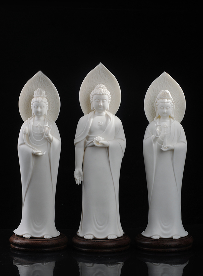 《佛光西方三圣》由國(guó)家高級(jí)/一級(jí)技師林弋新設(shè)計(jì)創(chuàng)作。作品以德化溫潤(rùn)如玉的 “中國(guó)白”為胎質(zhì),經(jīng)1300多度高溫?zé)疲ンw溫潤(rùn)如玉,瓷感細(xì)膩。