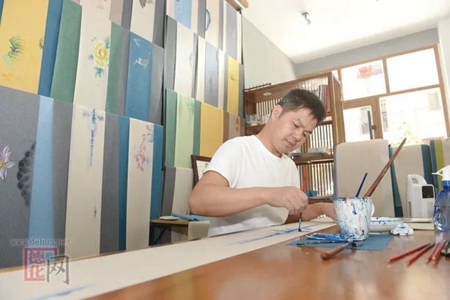 練志貴從廈門(mén)到德化創(chuàng)業(yè)已7年多,從事茶席文創(chuàng),現(xiàn)在把家安在茶具城二期,工作室名叫“藍(lán)橋雅室”,日常就是在茶席布上畫(huà)畫(huà),挺享受這樣安逸的生活。他介紹說(shuō),德化從事類似工作的有四五家,另外有不少企業(yè)制作布包布袋茶巾等,為茶室錦上添花。