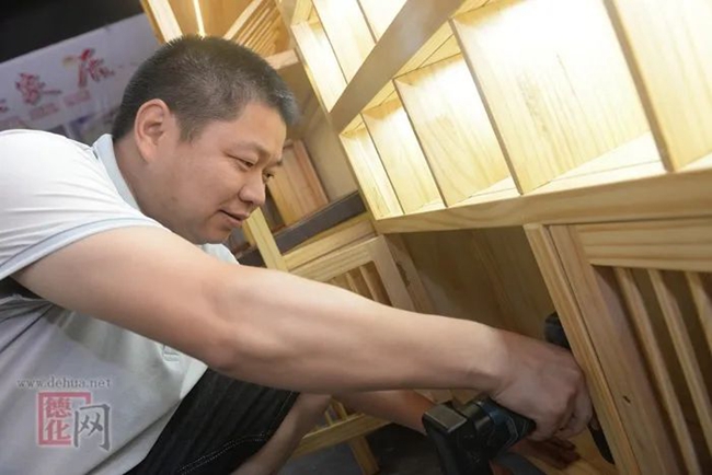 周金泉在安裝木制茶櫥柜