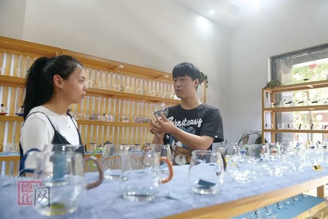 孔朋帥在介紹玻璃茶具