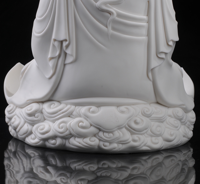 早在明代德化白瓷佛像就名聲在外,一代“瓷圣”何朝宗佛像名作流傳后世,成為世界各大博物館收藏的珍品,更對佛像雕塑史上產(chǎn)生深遠(yuǎn)的影響,形成“何派”雕塑,其開創(chuàng)的捏、塑、雕、刻、刮、削、接、貼八字技法延用至今。何派觀音雕塑注重于細(xì)節(jié)之美,精益求精,故而十分著意衣紋的刻畫,使線條流暢,翻轉(zhuǎn)自然。觀其佛像,仿佛有春風(fēng)拂面,衣袂飄揚(yáng)的出塵之感。