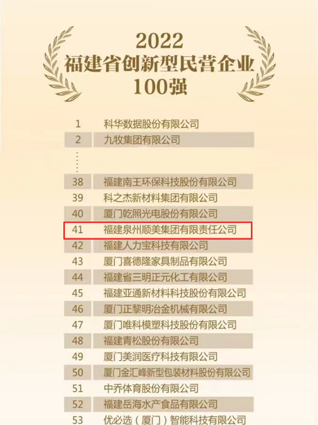 9月26日,福建省工商聯發(fā)布2022福建省民營企業(yè)100強、2022福建省制造業(yè)民營企業(yè)50強、2022福建省創(chuàng)新型民營企業(yè)100強三個榜單。順美集團榮列“2022福建省創(chuàng)新型民營企業(yè)100強”