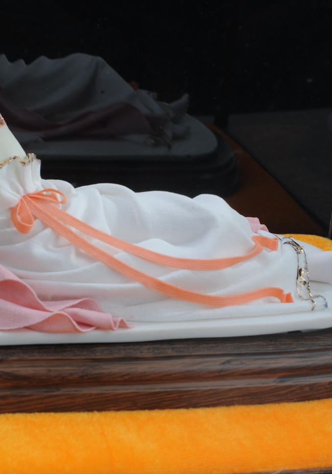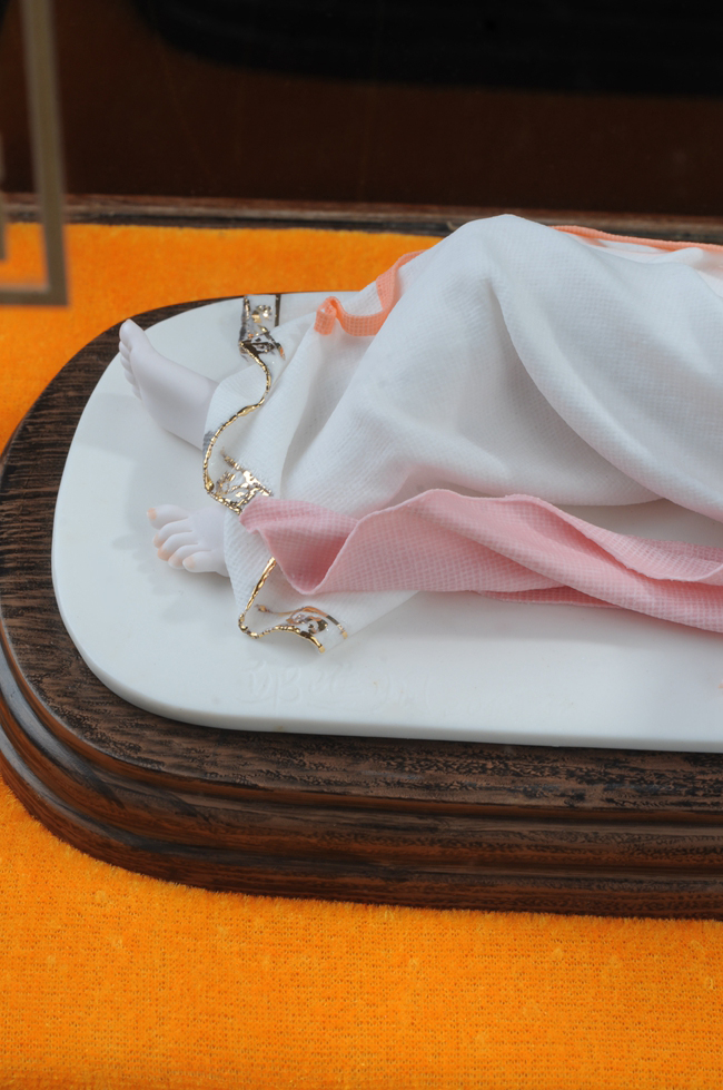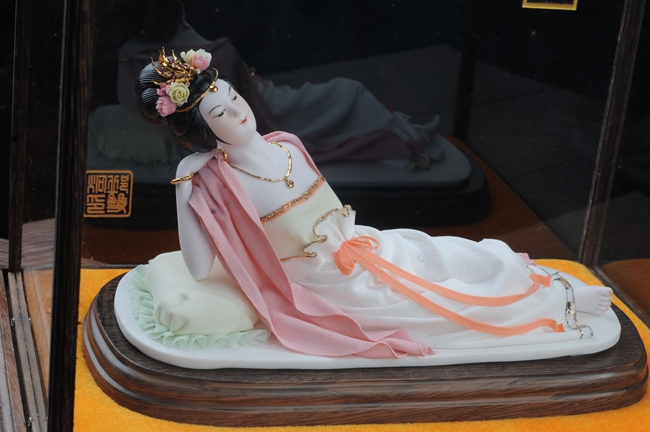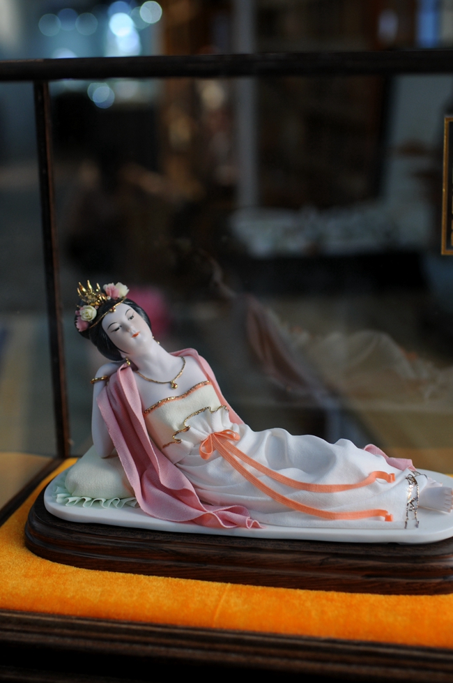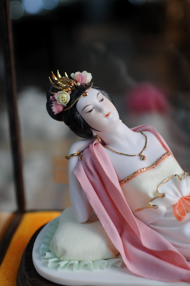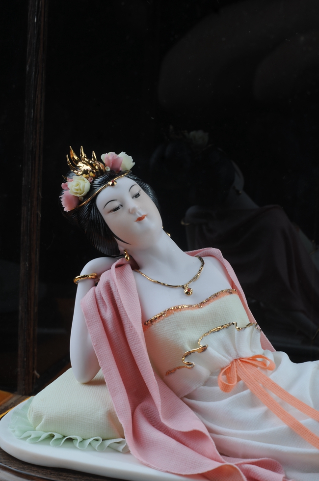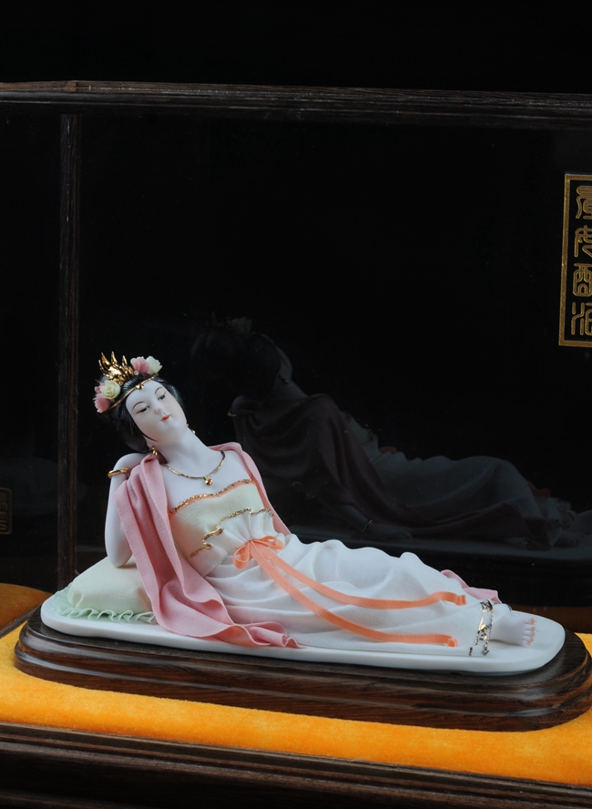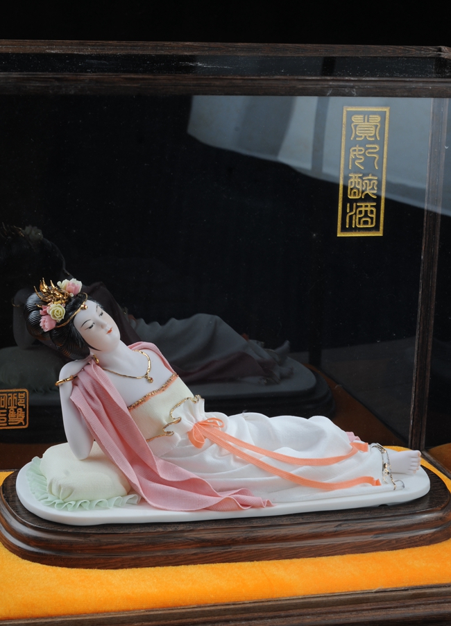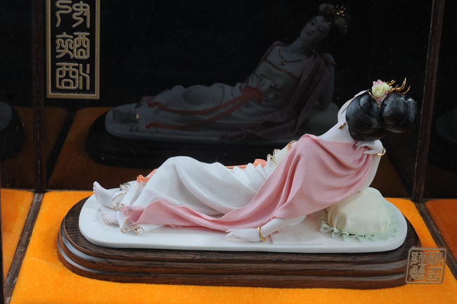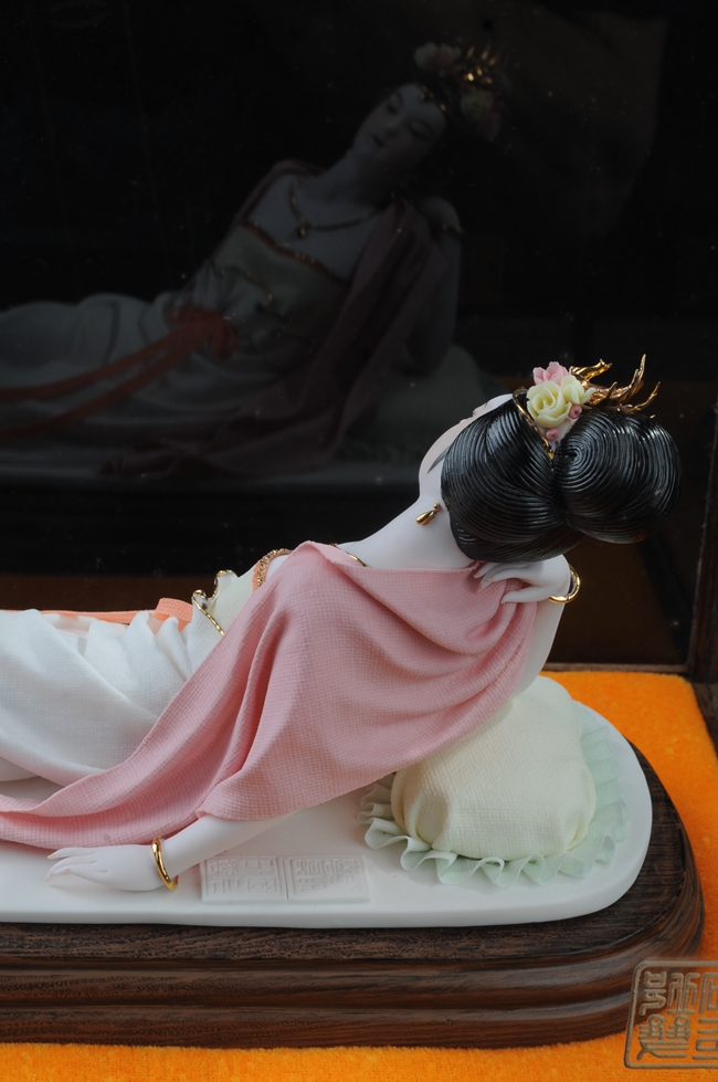 該作品彩用薄胎彩塑新技法,表現(xiàn)楊貴妃醉后側(cè)臥于玉床醉意綿綿的形態(tài)