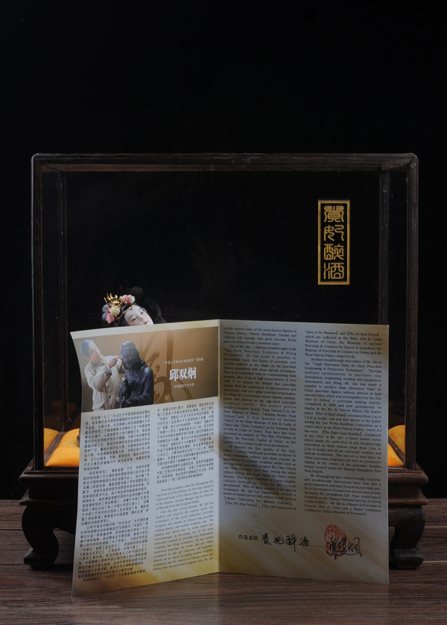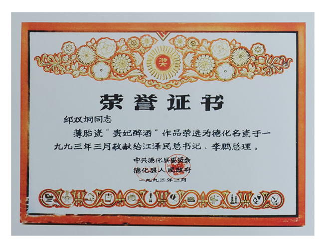 《貴妃醉酒》被中國(guó)國(guó)家歷史博物館、中國(guó)工藝美術(shù)館評(píng)為珍品并收藏;1993年《貴妃醉酒》被德化縣委、縣政府選為德化名瓷樣品敬獻(xiàn)給國(guó)家領(lǐng)導(dǎo)人,李鵬總理為德化親筆題詞“德化名瓷、瓷國(guó)明珠”。