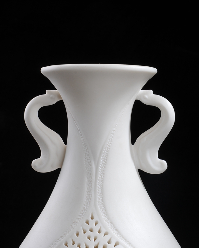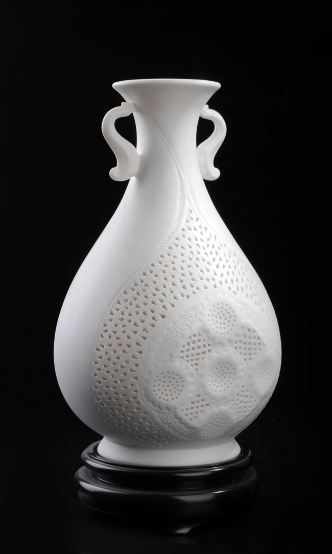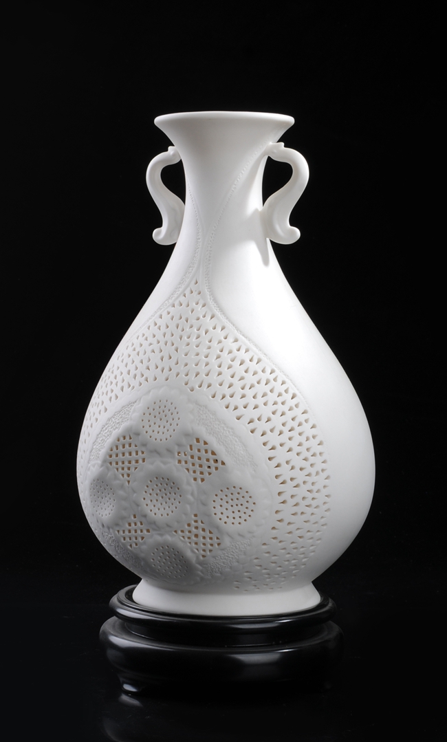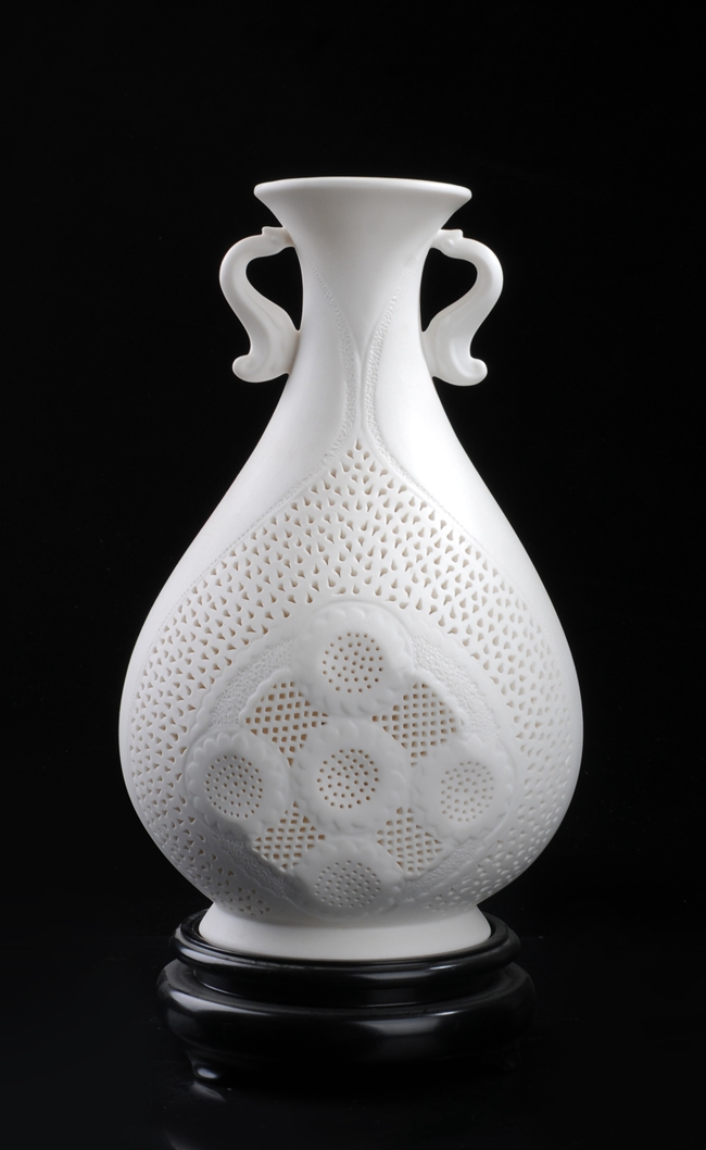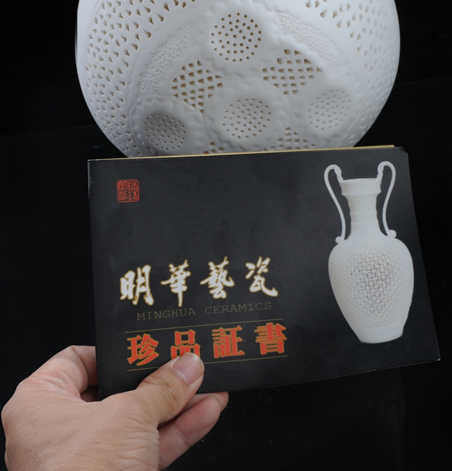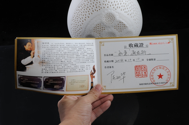 《如意通花》由中國(guó)陶瓷藝術(shù)大師陳明華設(shè)計(jì)創(chuàng)作。作品以德化溫潤(rùn)如玉的 “中國(guó)白”為胎質(zhì),經(jīng)1300多度高溫?zé),作品設(shè)計(jì)巧妙,雙耳以如意為造型設(shè)計(jì),線條流暢富有動(dòng)感,制作手法精妙、工序復(fù)雜,仿似在瓷中“剪紙”,瓷上“飛花”。整體清秀唯美,創(chuàng)意感足,作品底部落有大師手刻簽落款,兼具審美價(jià)值和收藏價(jià)值,是不可多得的雅作。是辦公、家居、書(shū)房裝飾擺設(shè)、禮贈(zèng)、收藏的好選擇。