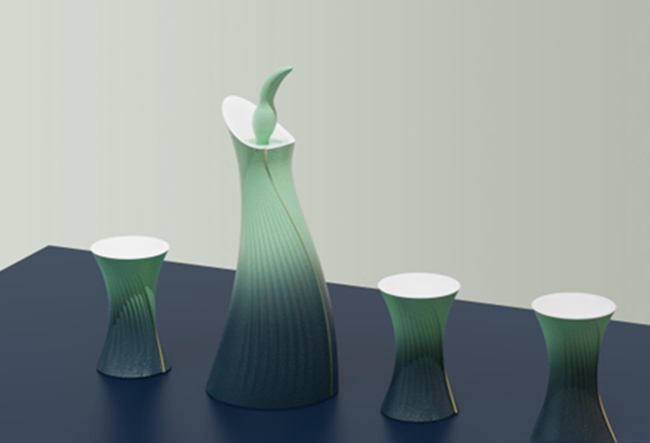 設(shè)計說明:只此青綠分酒器造型靈感來源舞蹈詩劇《只此青綠》,整體造型宛若舞者衣袂翩翩,以當(dāng)代的表達方式敘述悠遠綿長的傳統(tǒng)文化意境。千里江山青綠的漸變釉色配合條紋的造型讓人感受到虛實交錯的美感。頂部放大的壺嘴讓酒更容易倒入瓶內(nèi);延長的壺嘴使出斷水利落卻細膩,便于分酒。