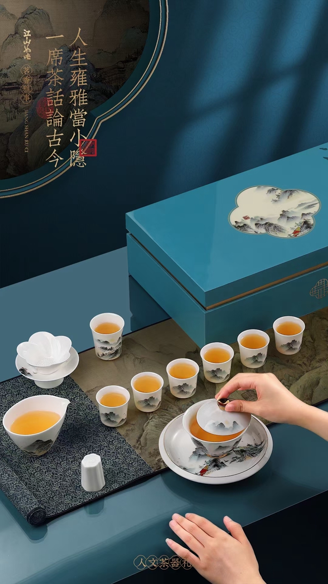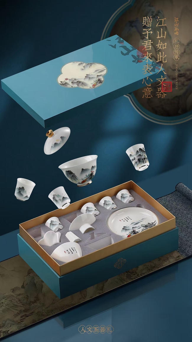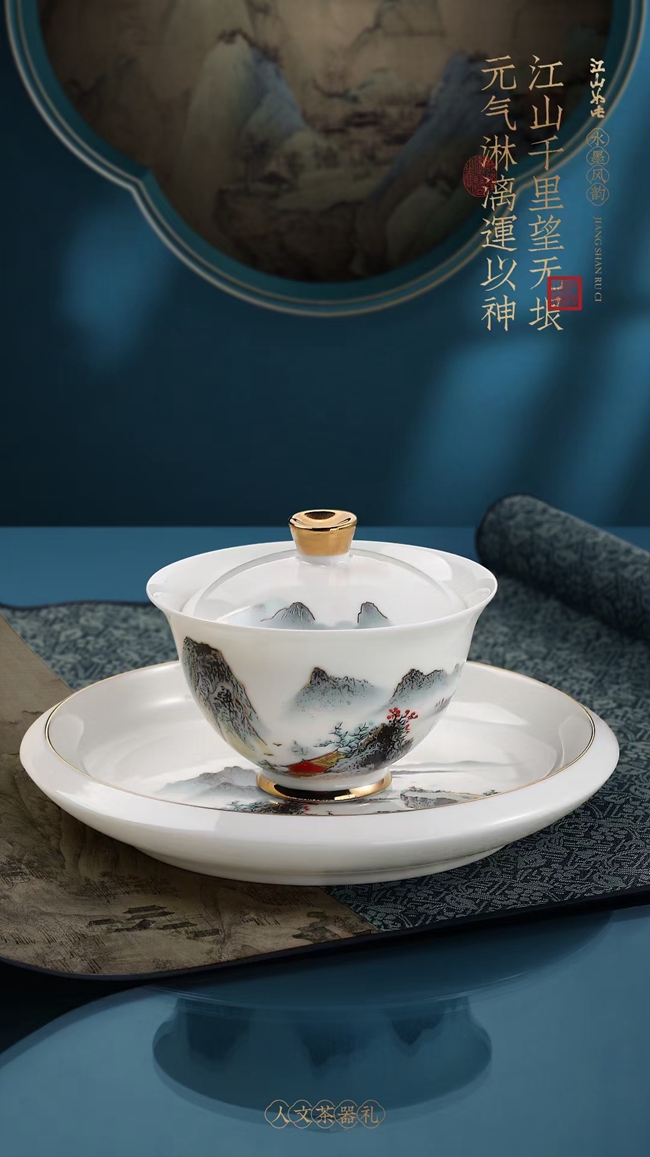 江山如此羊脂玉茶具器由工藝美術大師設計,精選優(yōu)質高嶺土,經(jīng)加工1300多度高溫燒制而成,其瓷質溫潤似玉、透光性強,胎骨潔白,作品采用手工堆金描金工藝,采用中國水墨山水畫設計,瓷坯為紙,匠心手繪,筆觸瀟灑,意境水墨畫,鎏金點綴,品質尊貴,禮盒包裝上檔次,是品茶、家居、禮品好選擇。