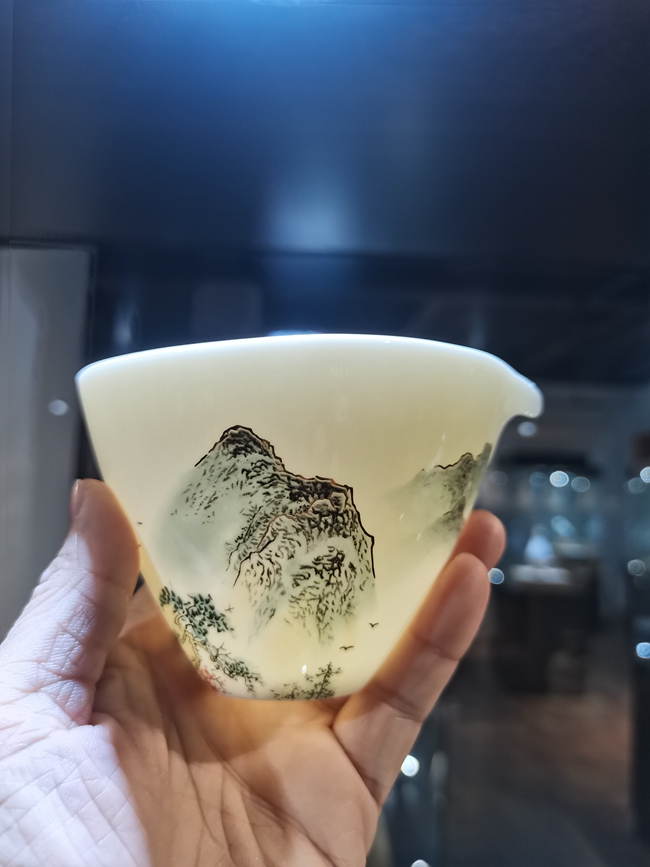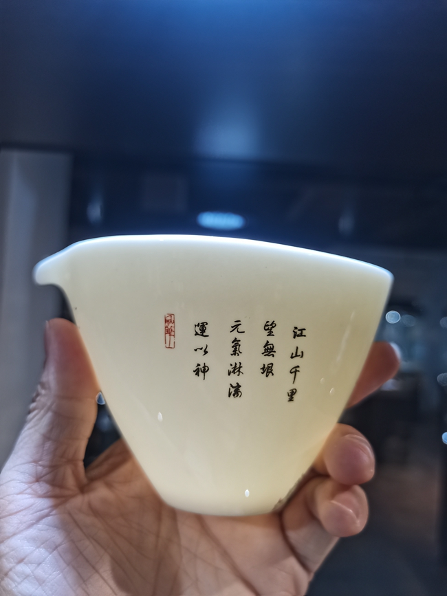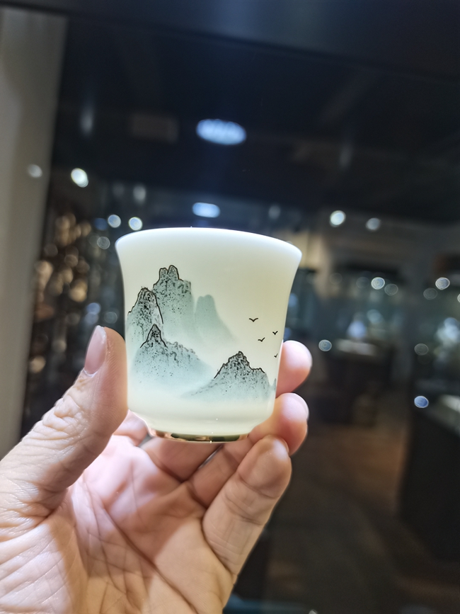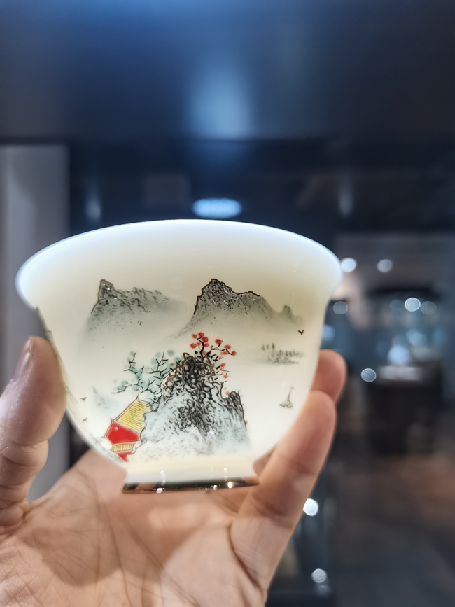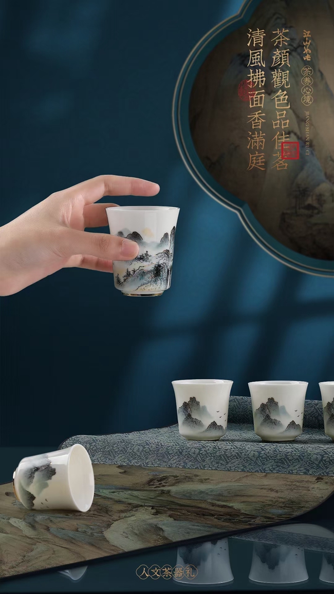 手工描繪江山圖,鎏金工藝點綴,金絲環(huán)繞,燒制后精美圖案展示在眼前,杯底邊沿描金點綴,金光熠熠,美觀大氣,十分驚艷。