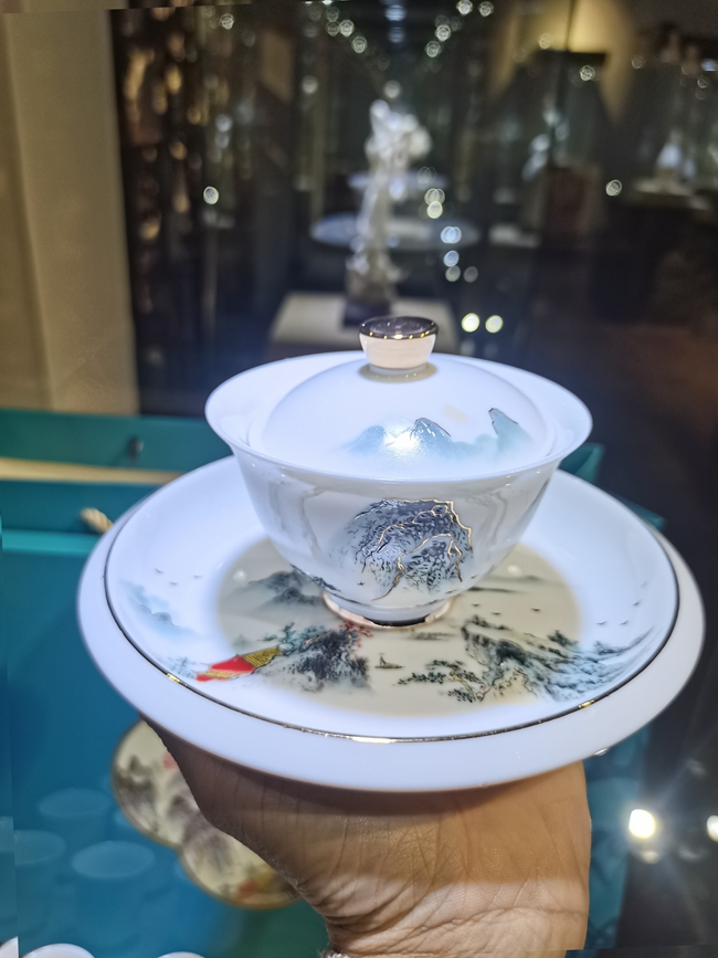 燈光照耀下,瓷質似玉,通透明亮,質感細膩溫潤,給人以溫柔甜凈之感,描金裝飾點綴,圈足工整,頗具藝術欣賞價值,值得細細品玩!