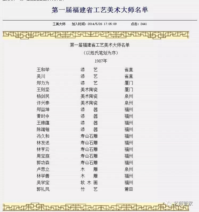 對于前五屆福建省工藝美術大師評選,符合一定條件且長期從事工藝美術制作的人員,經省評審委員會評審為福建省工藝美術大師的,由省傳統(tǒng)工藝美術主管部門報省人民政府批準認定后,由省人民政府授予“福建省工藝美術大師”稱號并頒發(fā)證書:經省評審委員會評審為福建省工藝美術名人的,由省傳統(tǒng)工藝美術主管部門認定后授予“福建省工藝美術名人”稱號并頒發(fā)證書。