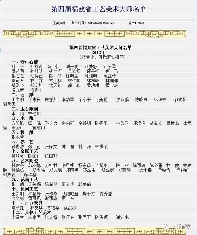 (4)獲得福建省工藝美術名人稱號或者具有高級工藝美術師職稱,或者被認定為福建省省級非物質文化遺產代表性傳承人。