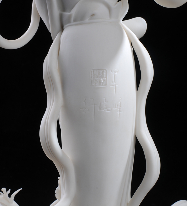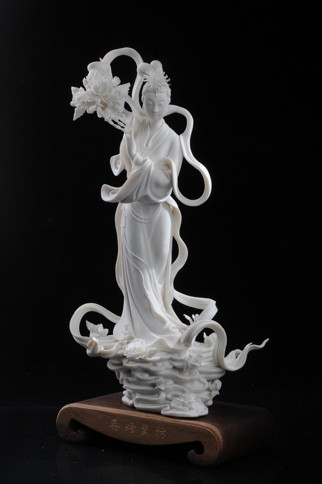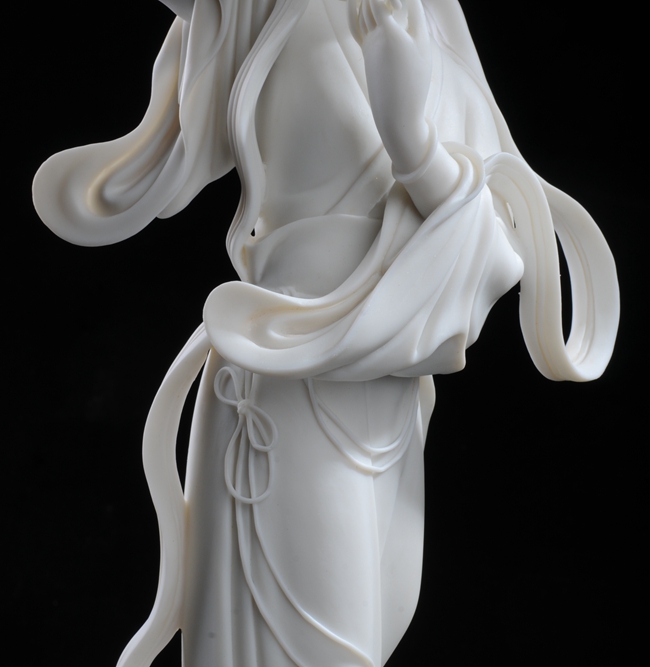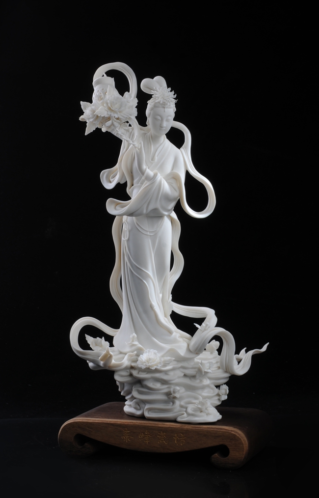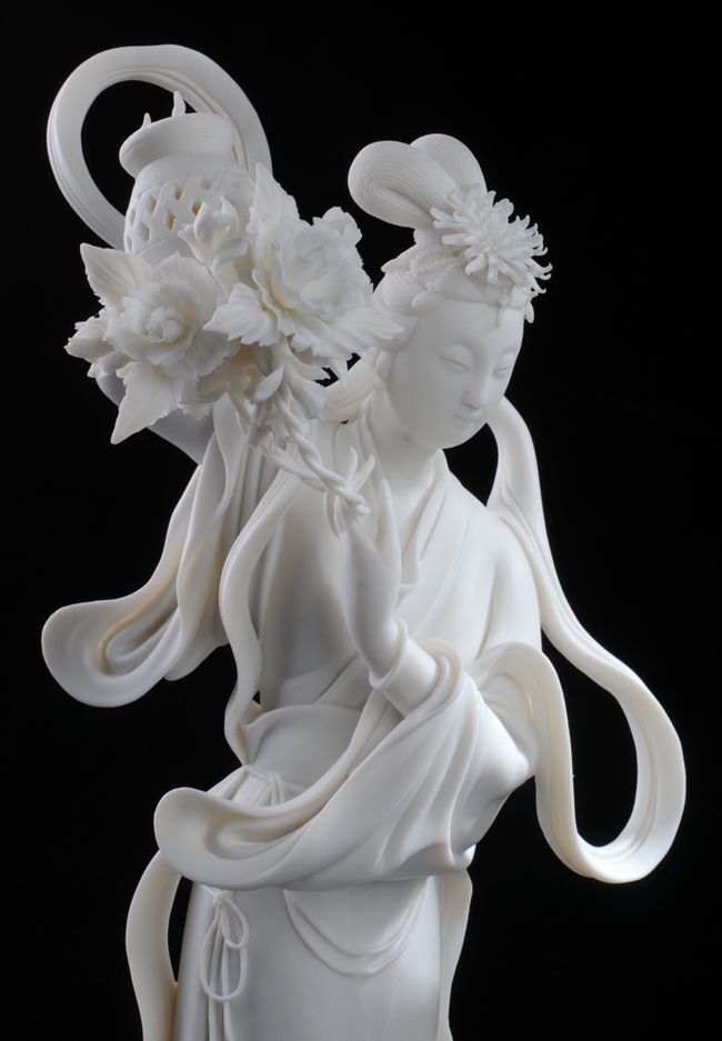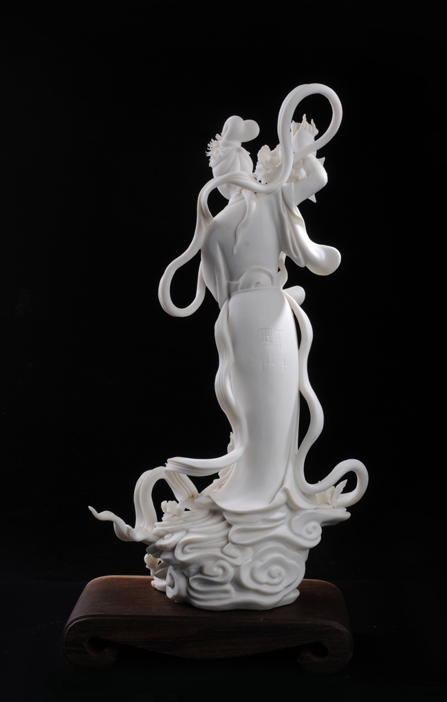 德化是“中國白的故鄉(xiāng)”,在世界瓷壇獨樹一幟,被稱為“世界白瓷之母”,德化白瓷溫潤、明凈、典雅、精巧,被稱“象牙白”、“鵝絨白”,素有“世界白瓷看中國,中國白瓷看德化”之稱。早在明代德化白瓷就名聲在外,一代“瓷圣”何朝宗名作流傳后世,成為世界各大博物館收藏的珍品,更對雕塑史上產(chǎn)生深遠的影響,形成“何派”雕塑,其開創(chuàng)的捏、塑、雕、刻、刮、削、接、貼八字技法延用至今。何派雕塑注重于細節(jié)之美,精益求精,故而十分著意衣紋的刻畫,使線條流暢,翻轉(zhuǎn)自然。觀其作品仿佛有春風拂面,衣袂飄揚的出塵之感。