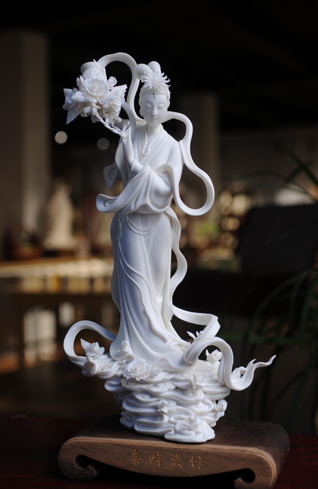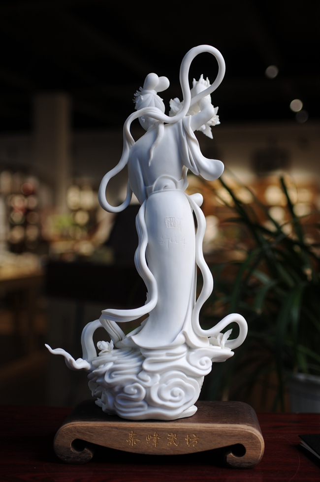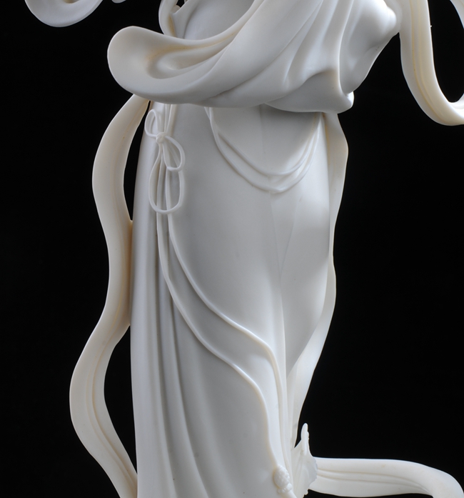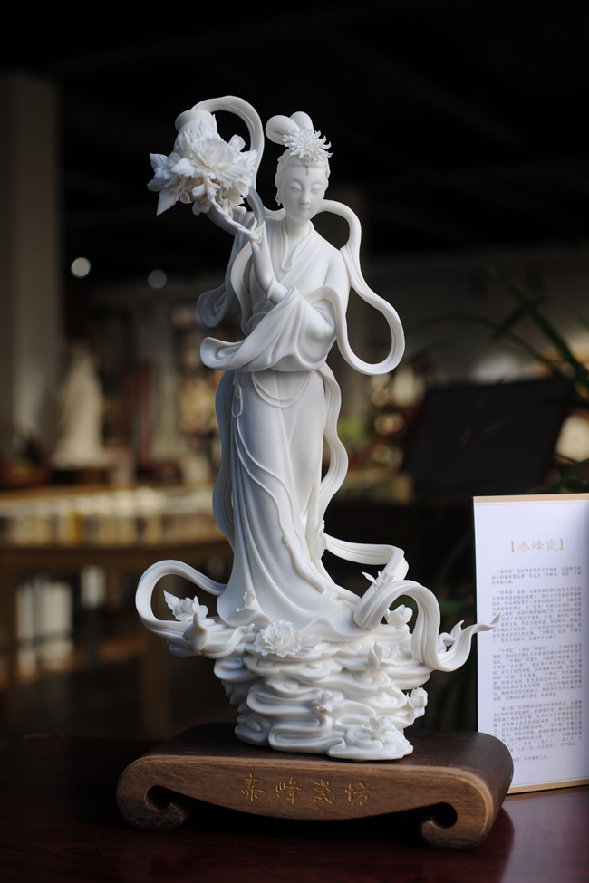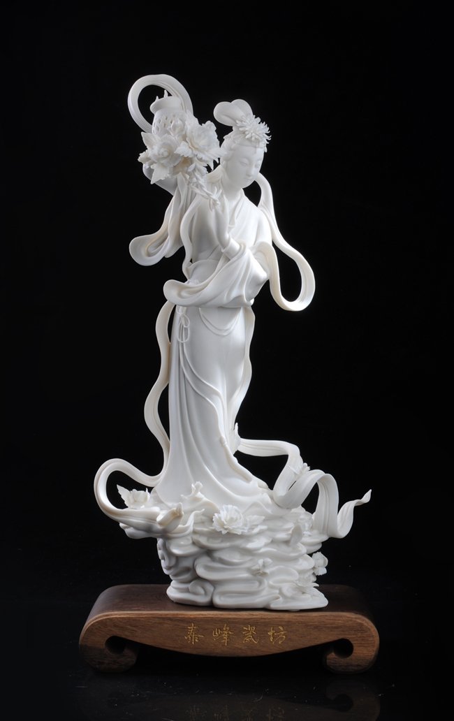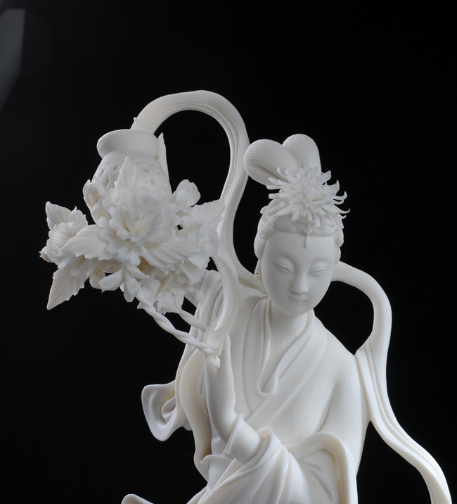 德化是“中國白的故鄉(xiāng)”,在世界瓷壇獨樹一幟,被稱為“世界白瓷之母”,德化白瓷溫潤、明凈、典雅、精巧,被稱“象牙白”、“鵝絨白”,素有“世界白瓷看中國,中國白瓷看德化”之稱。早在明代德化白瓷就名聲在外,一代“瓷圣”何朝宗名作流傳后世,成為世界各大博物館收藏的珍品,更對雕塑史上產(chǎn)生深遠的影響,形成“何派”雕塑,其開創(chuàng)的捏、塑、雕、刻、刮、削、接、貼八字技法延用至今。何派雕塑注重于細節(jié)之美,精益求精,故而十分著意衣紋的刻畫,使線條流暢,翻轉(zhuǎn)自然。觀其作品仿佛有春風拂面,衣袂飄揚的出塵之感。