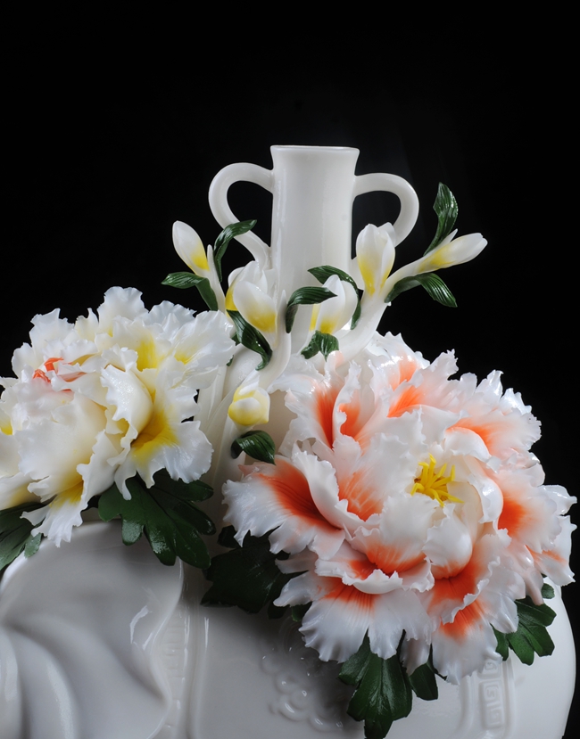 采用高嶺土為制作材料,經(jīng)手工雕刻,牡丹花刻畫一絲不茍或薄如蟬翼,或嬌艷欲滴,最終形成件美輪美奐的瓷藝術(shù)作品。