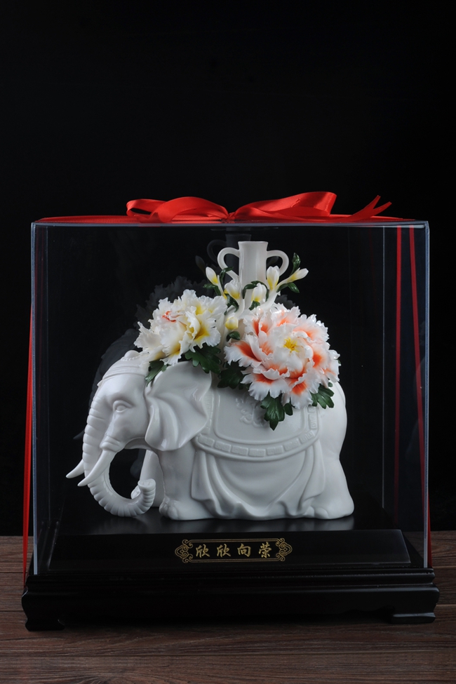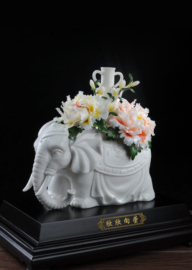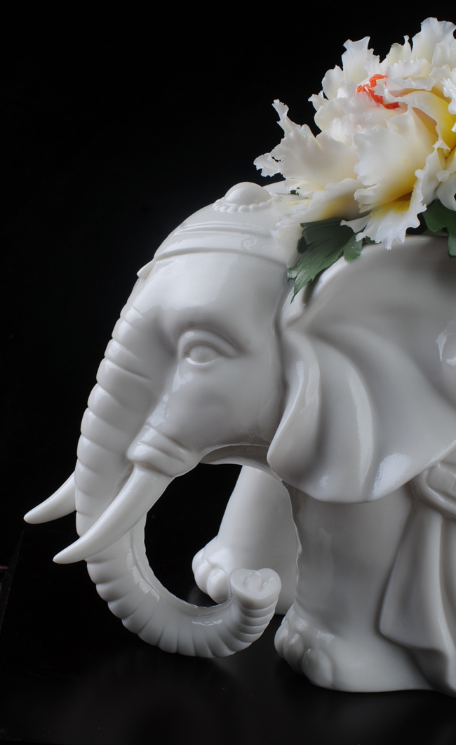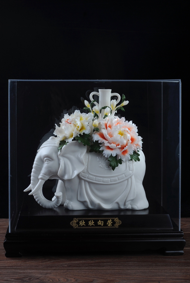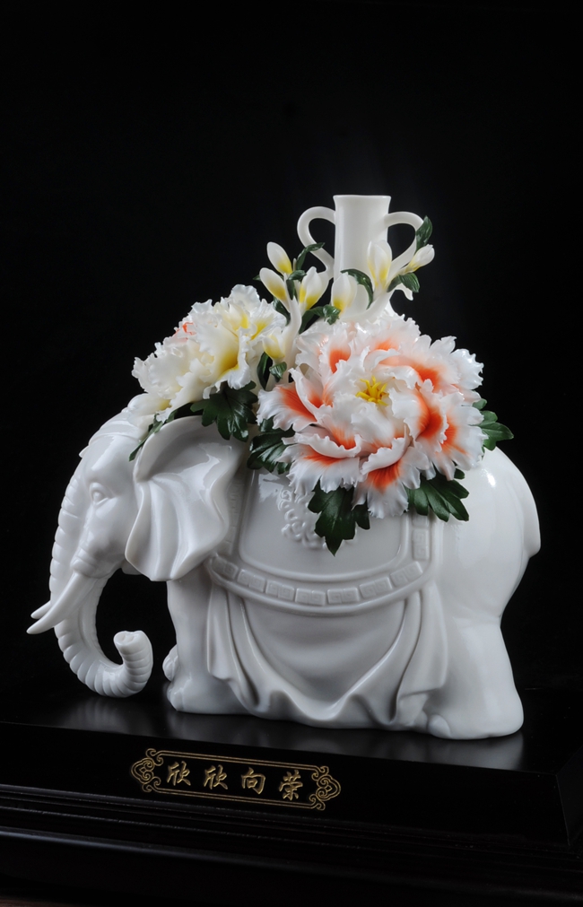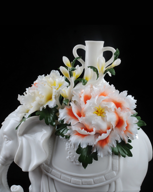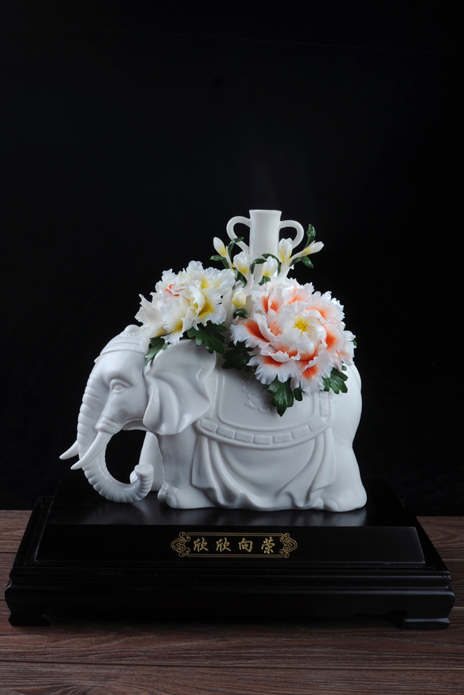 作品雕刻精細(xì),形象逼真地再生再現(xiàn)了大象、牡丹花、綠葉的形態(tài)、神韻、色彩和特殊寓意,立體陶瓷造型真實(shí)感強(qiáng),巧奪天工,相互映襯,相得益彰。